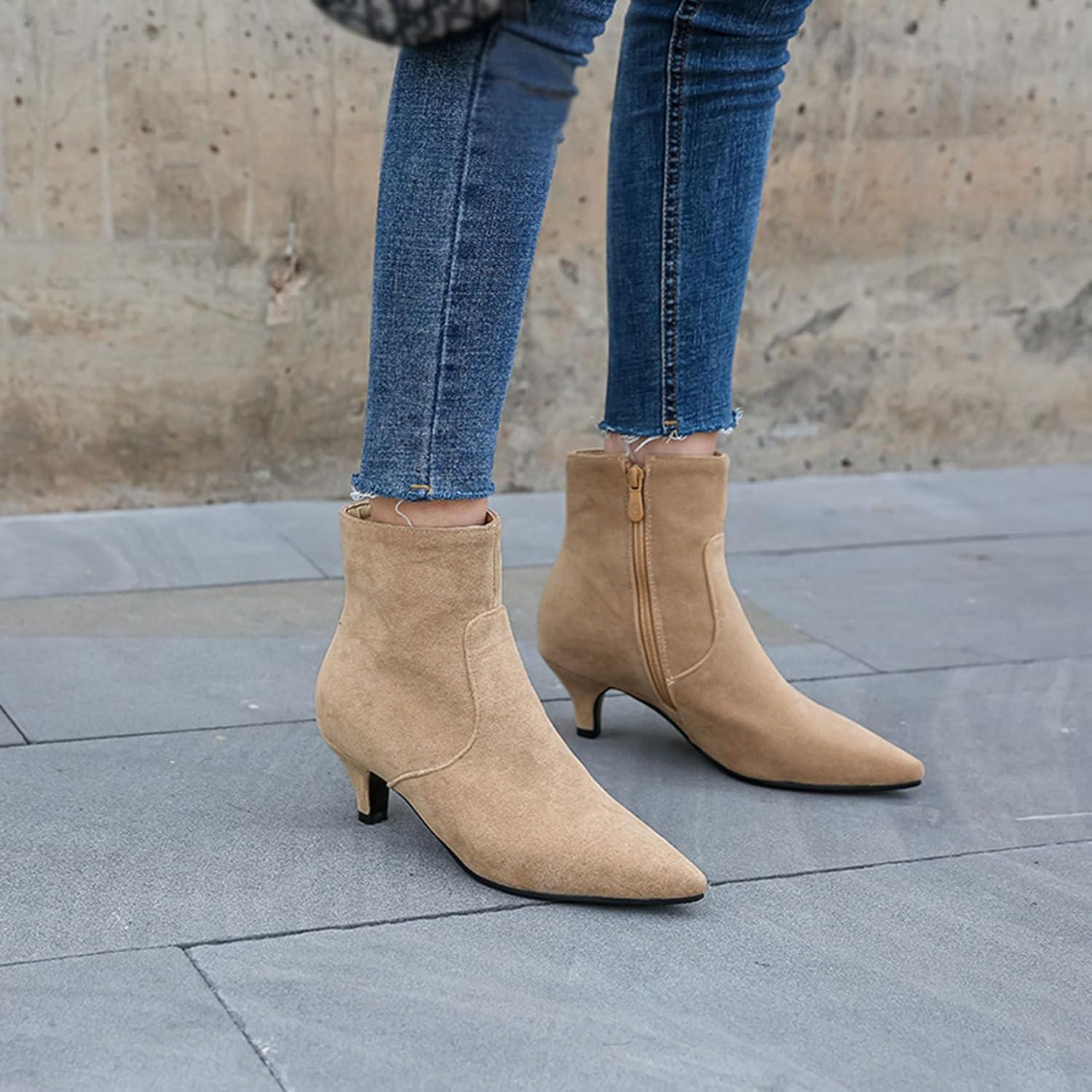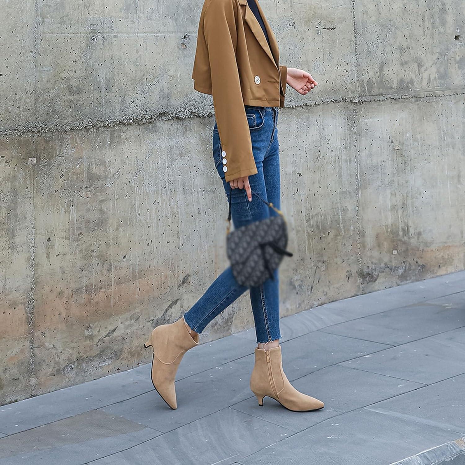 SHEMEE Fashion Womens Kitten Heels Ankle Boots Sexy Pointy Toe Booties Mid Heels Zipper Work Party Dress Shoes Apricot Suede,Size 8.5