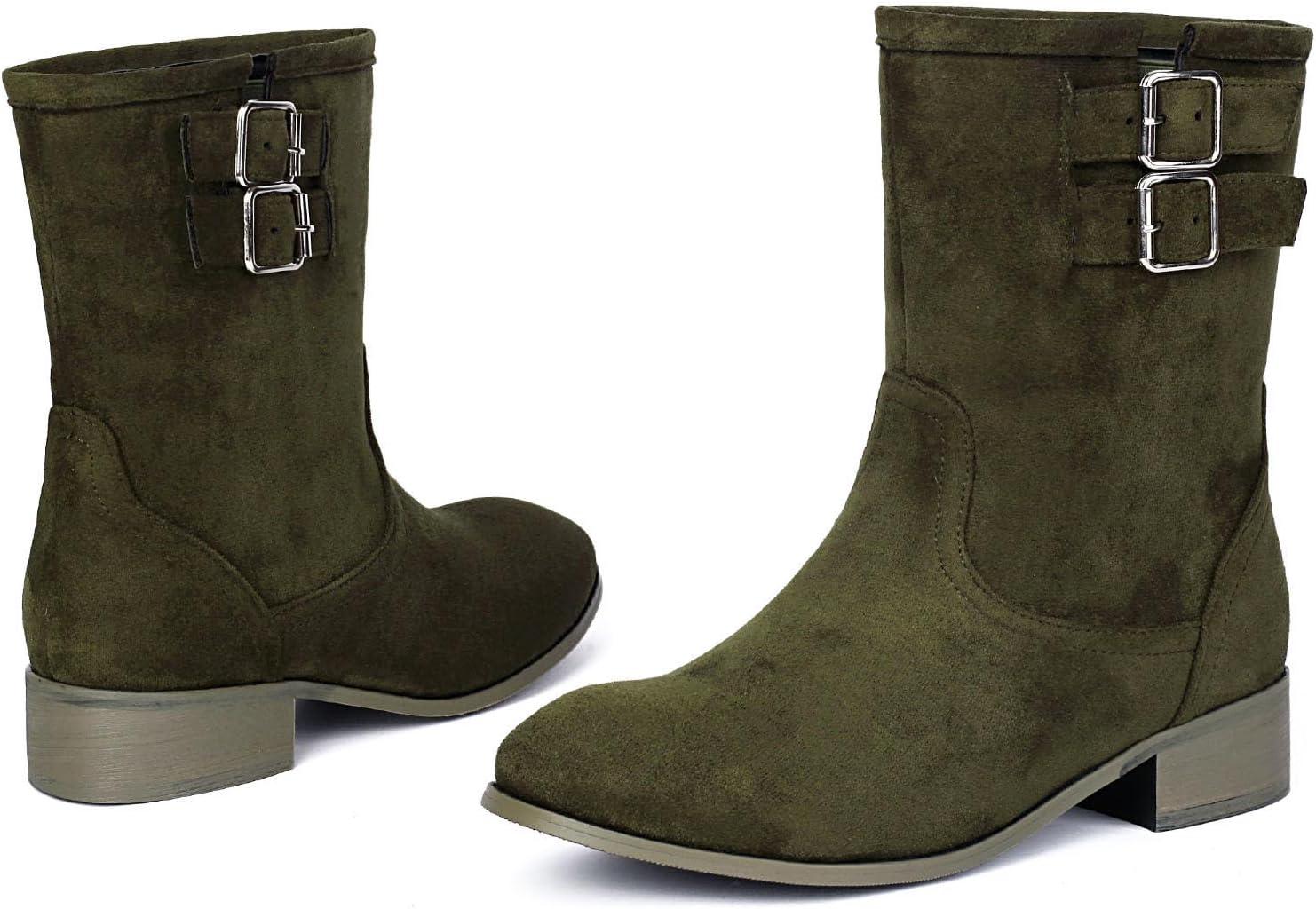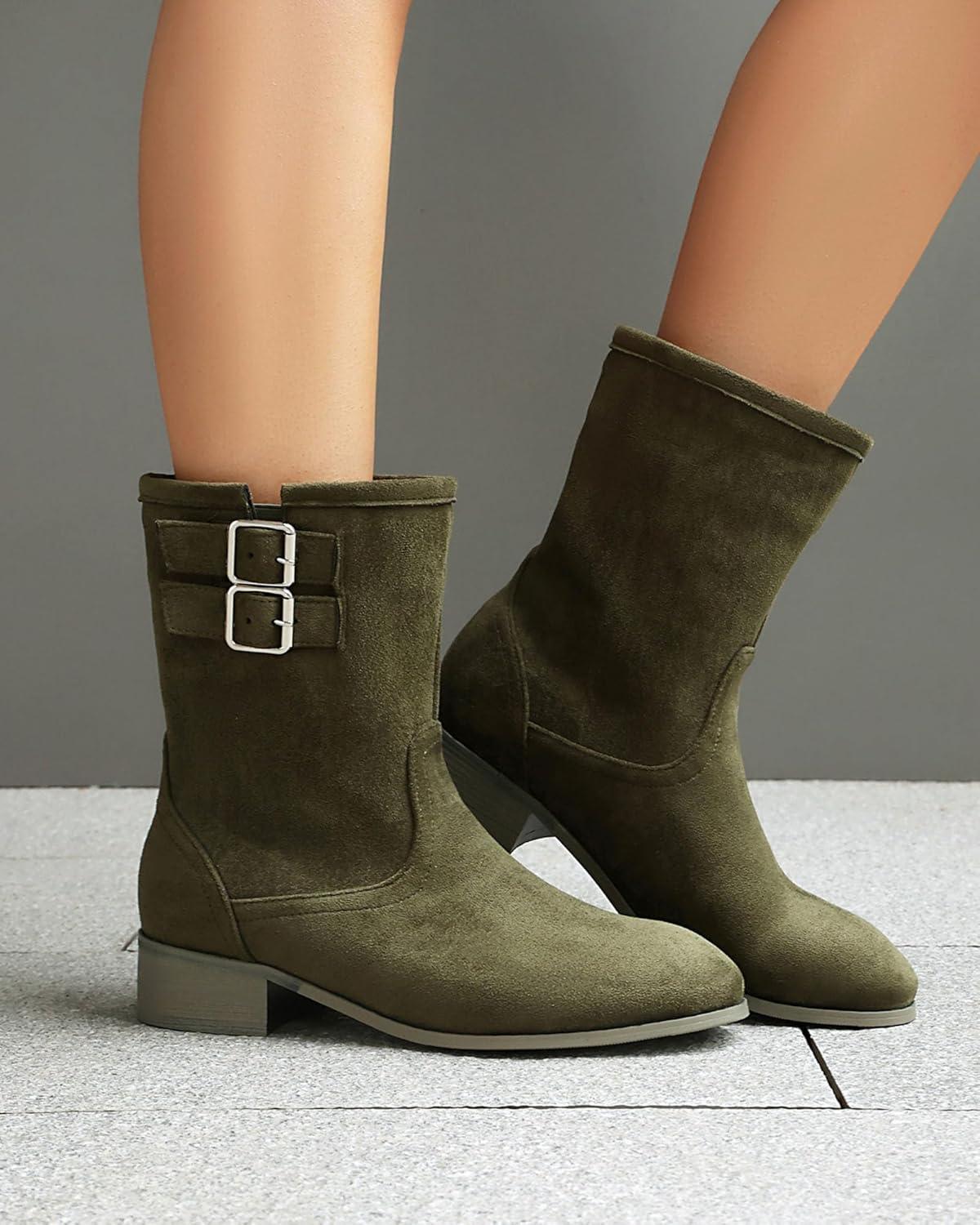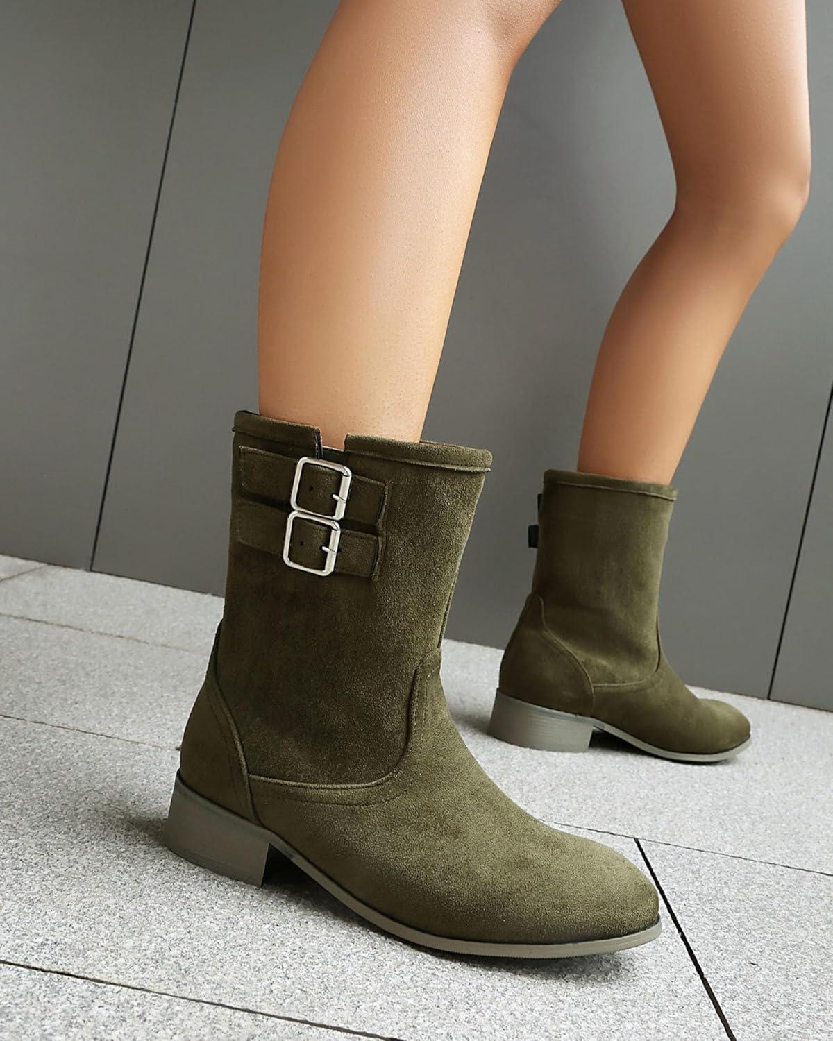SHEMEE Faux Suede Mid Calf Boots for Women Chunky Low Heels Fashion Buckles Riding Booties Block Heel Matte Leather Fall Winter Shoes Pull On(Dark Green)