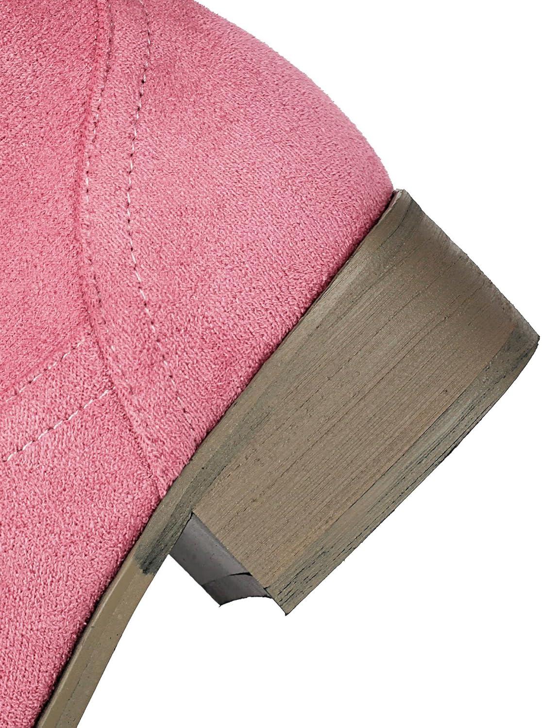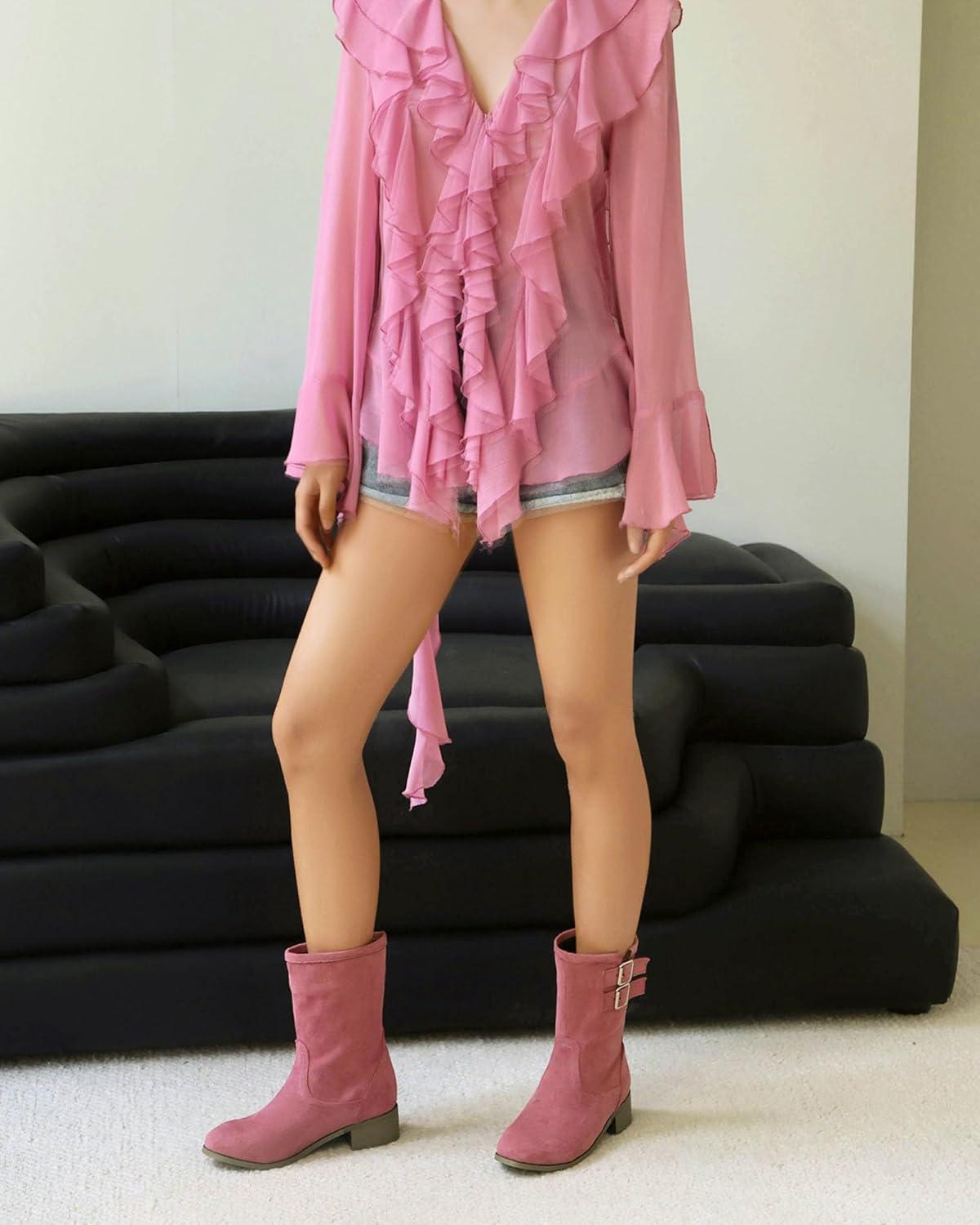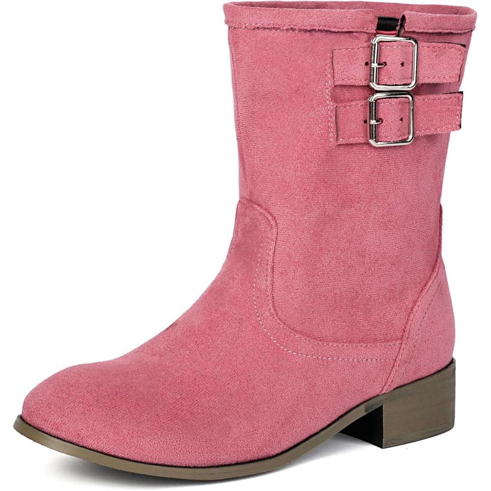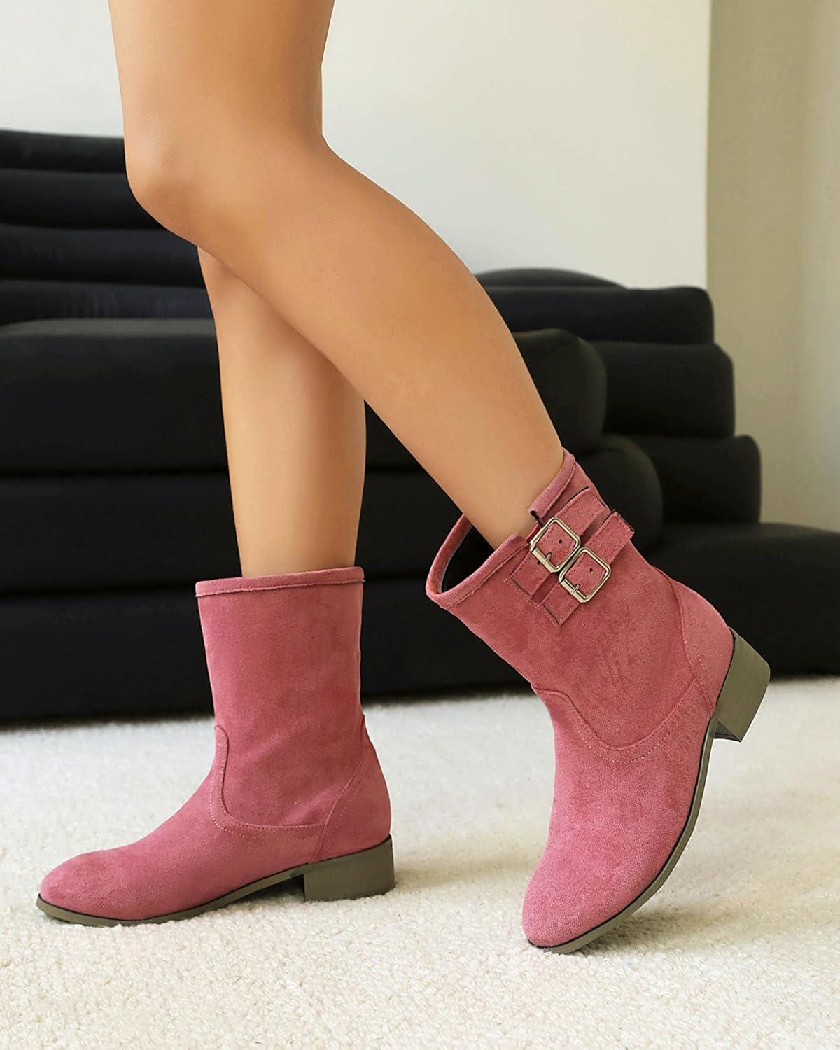 SHEMEE Faux Suede Mid Calf Boots for Women Chunky Low Heels Fashion Buckles Riding Booties Block Heel Matte Leather Fall Winter Shoes Pull On(Pink)