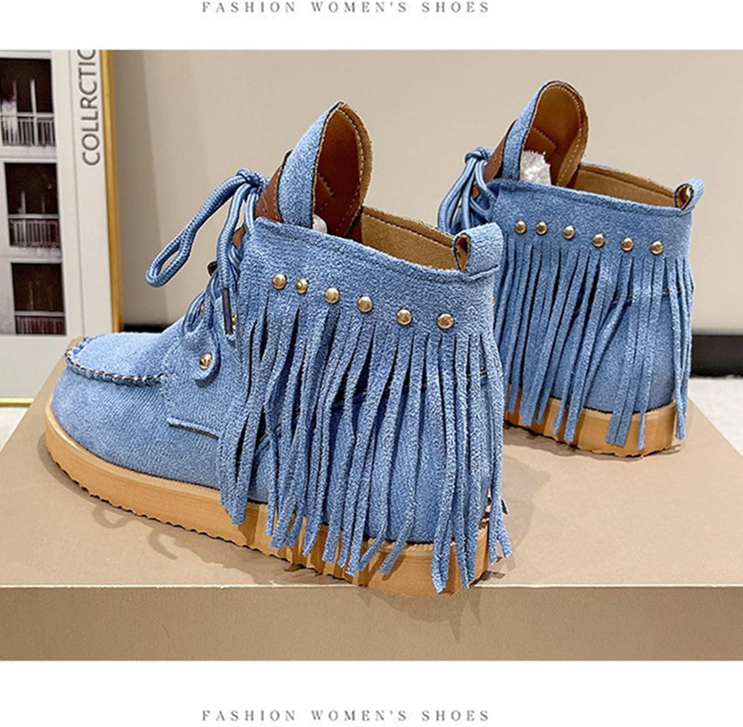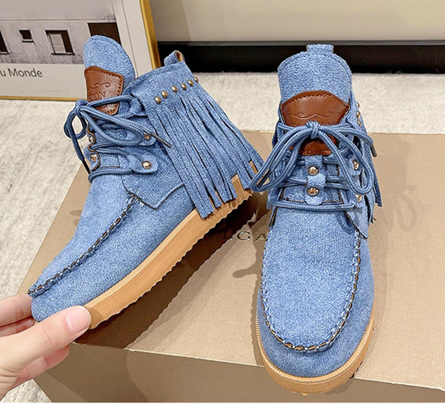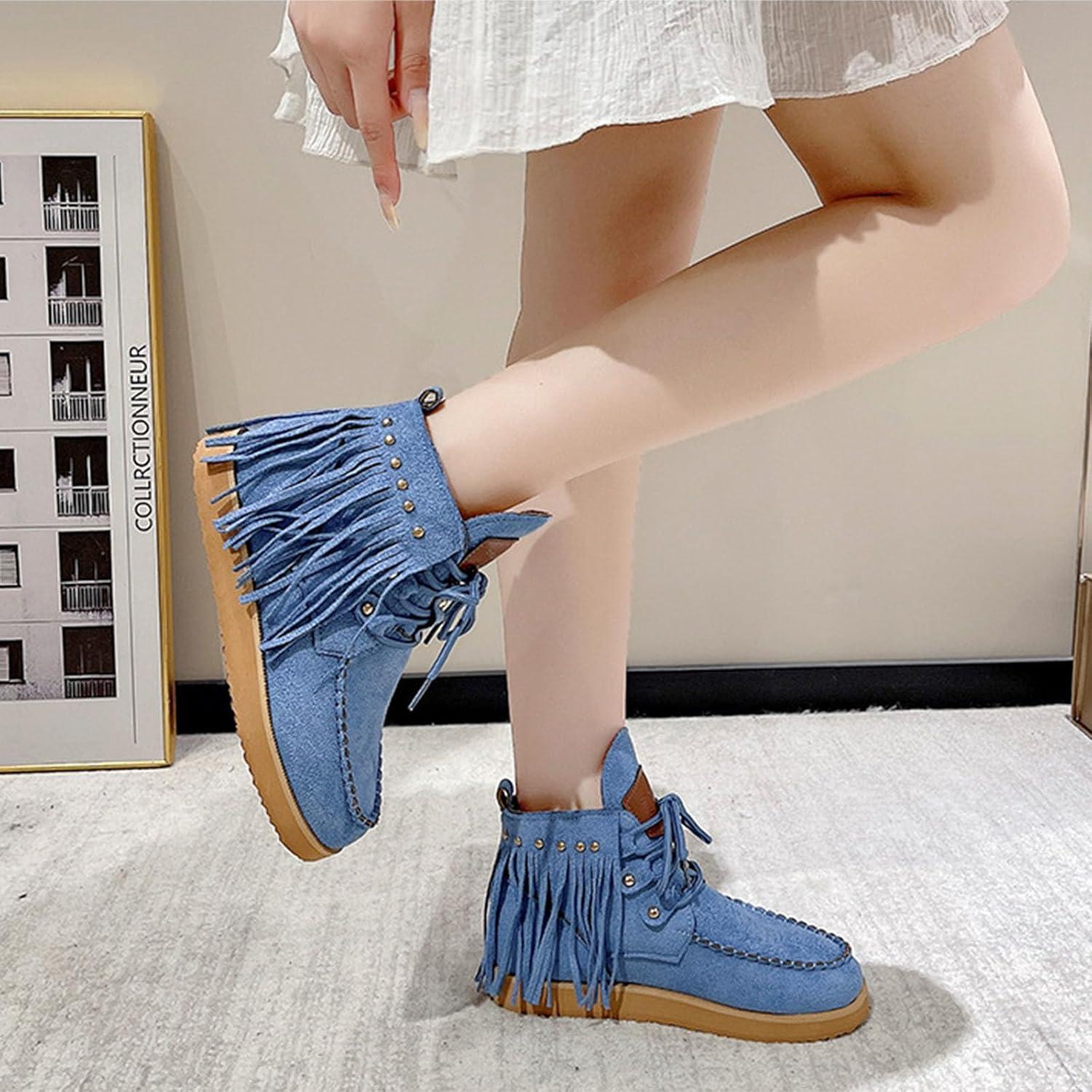 SHEMEE Fringe Ankle Booties for Women Studded Lace Up Flat Boots Faux Suede Round Toe Lightweight Western Outdoor Travel Short Boots(Blue)
