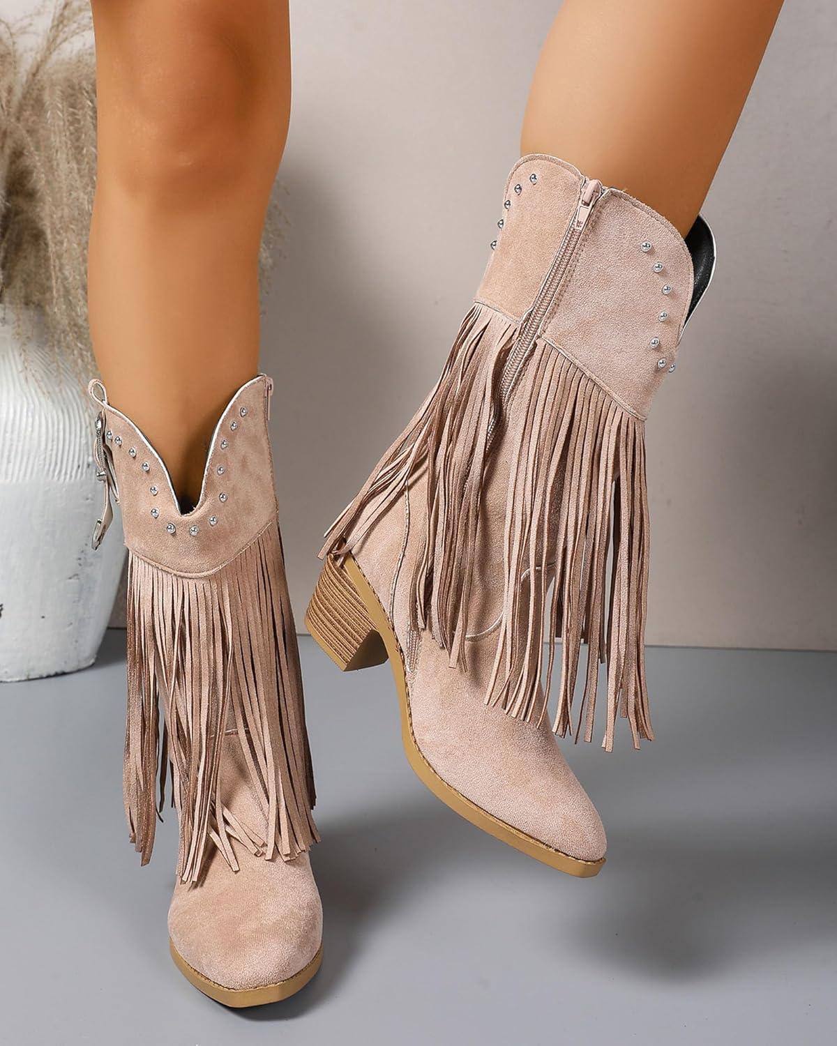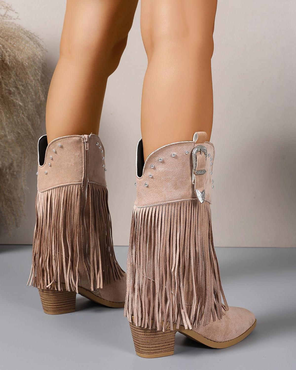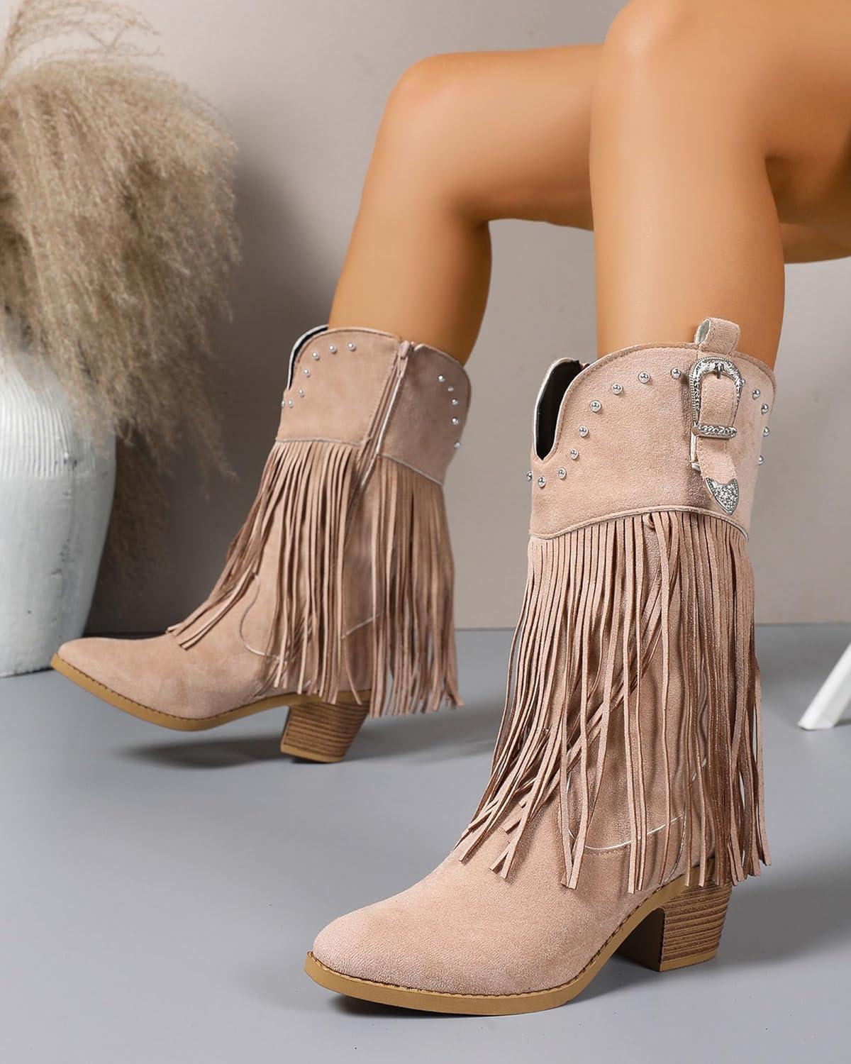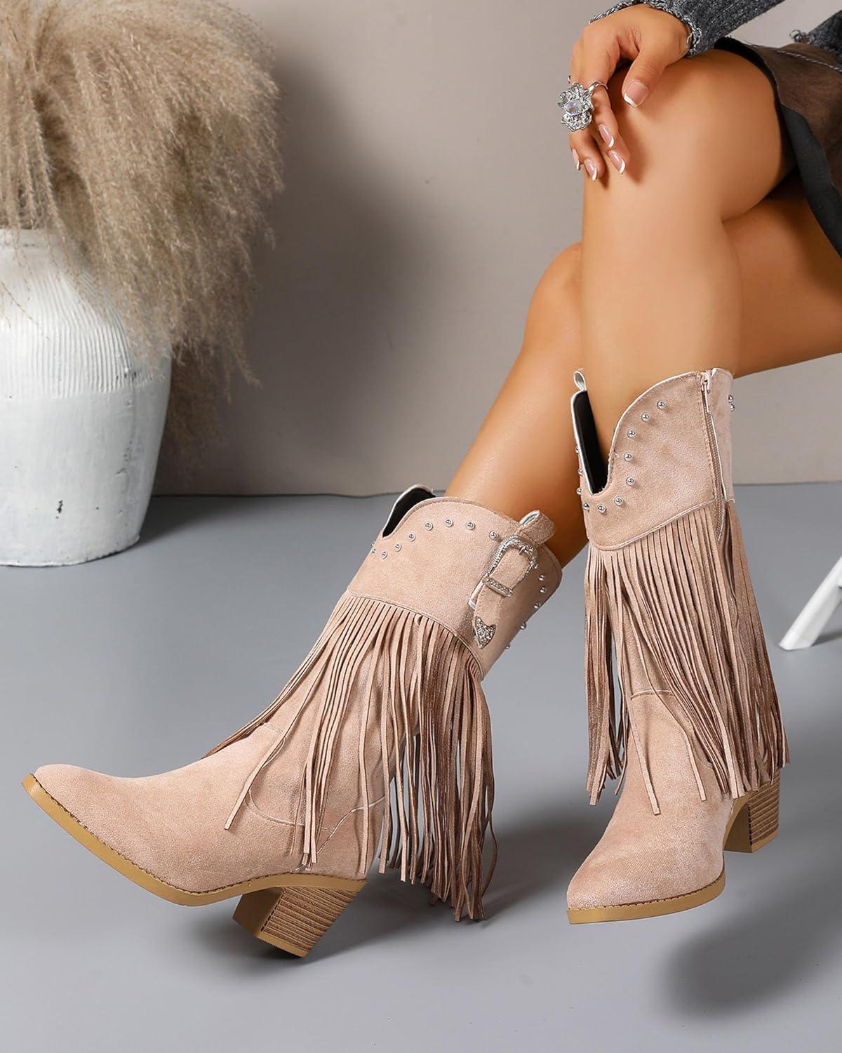 SHEMEE Fringe Cowboy Boots for Women Mid Calf Stacked Chunky Heels Western Cowgirl Boots Fashion Studded Buckled Accents Almond Pointy Toe Zipper Tall Boots Country Music Festival Dress Shoes(Apricot)