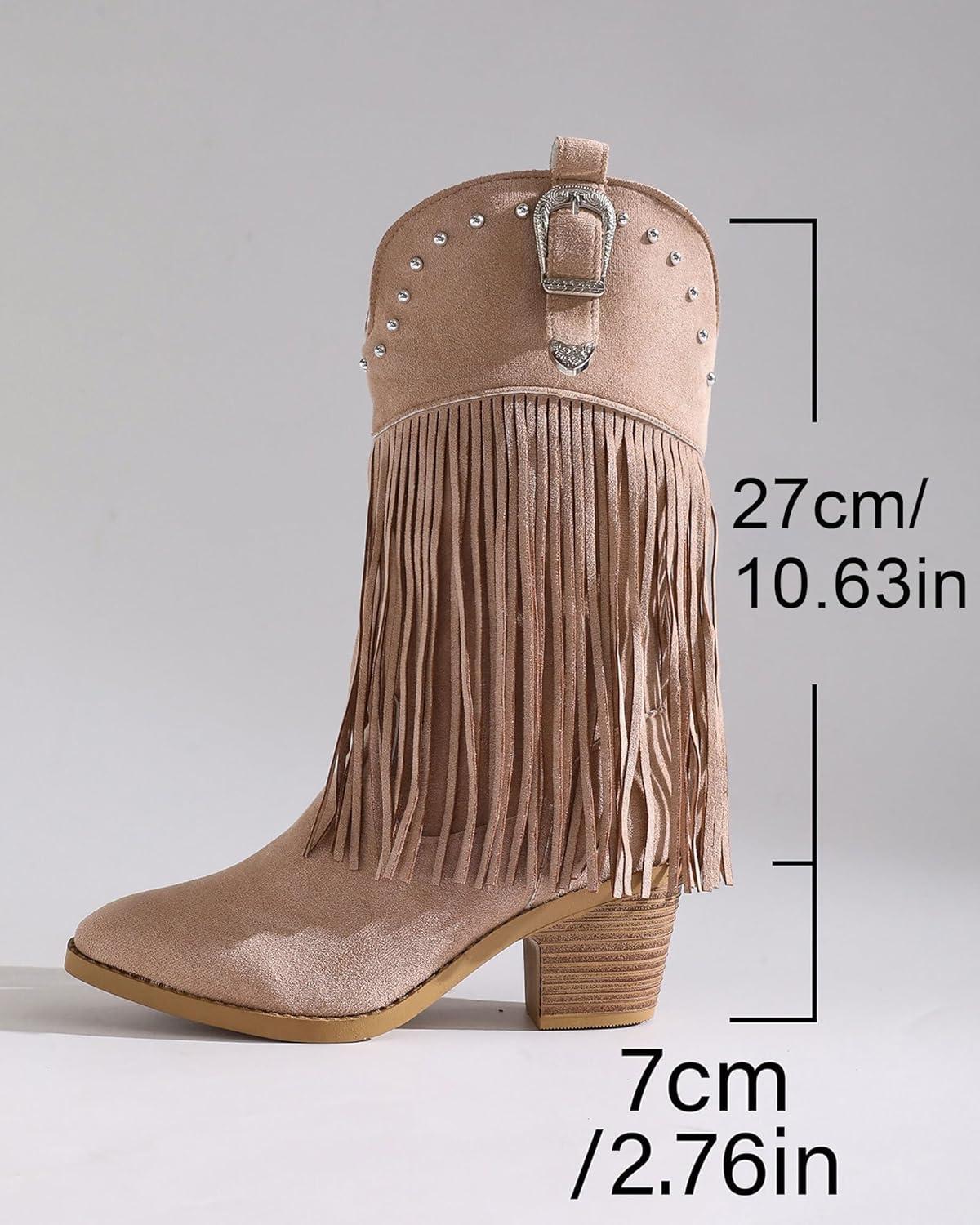 Perfect sturdy and edgy chunky heel design that can keep comfortable. Fashion chic fringe cowboy boots women faux suede mid calf boot which highlights your elegant,confidence,cute,beauty and sophisticated look.