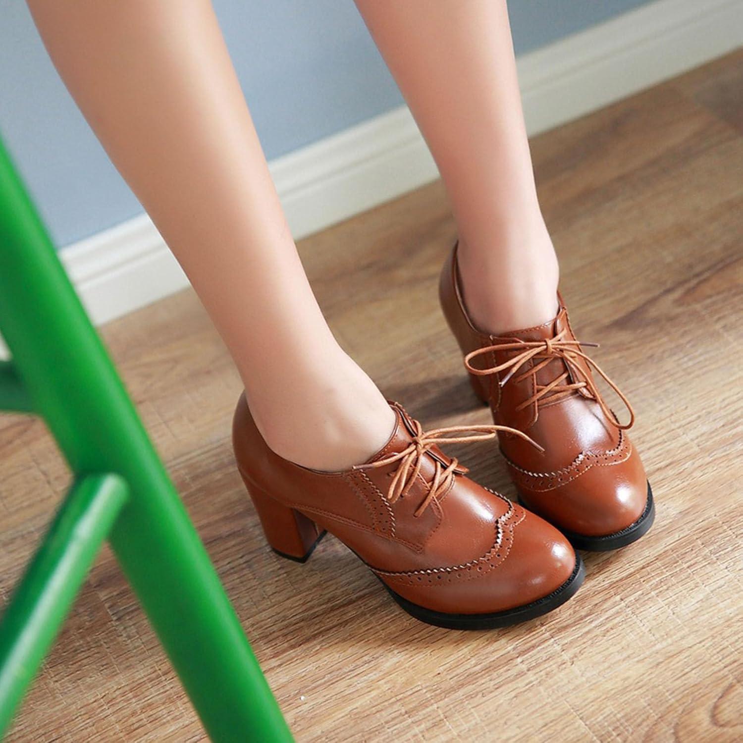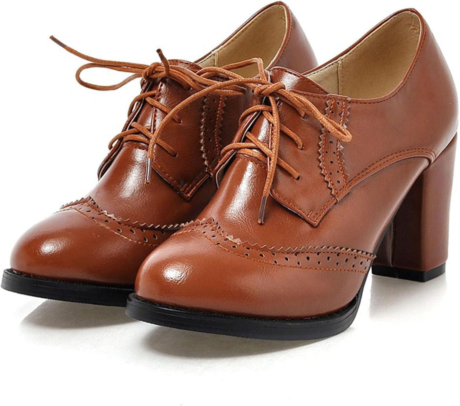 SHEMEE Retro Wingtip Oxfords for Women Chunky Block Heels Brogues Saddle Shoes Round Toe Lace Up Pumps Thick High Heeled Ankle Booties(Brown)