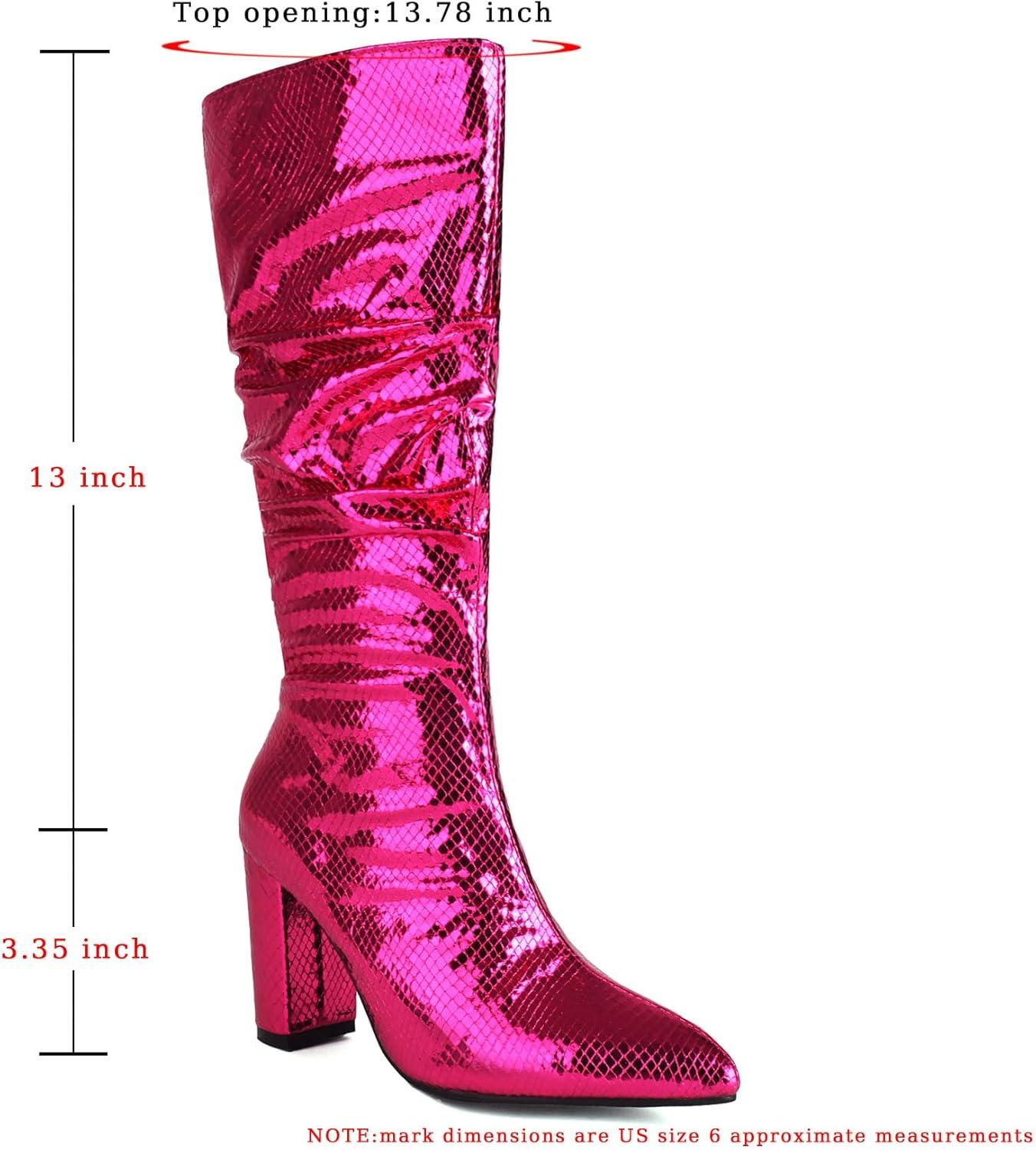 SHEMEE Sparkly Mid Calf Slouch Boots Sequins Chunky High Heels Boots Pointed Toe Block Heeled Disco Boots For Saloon Girl Ladies(Hot Pink)