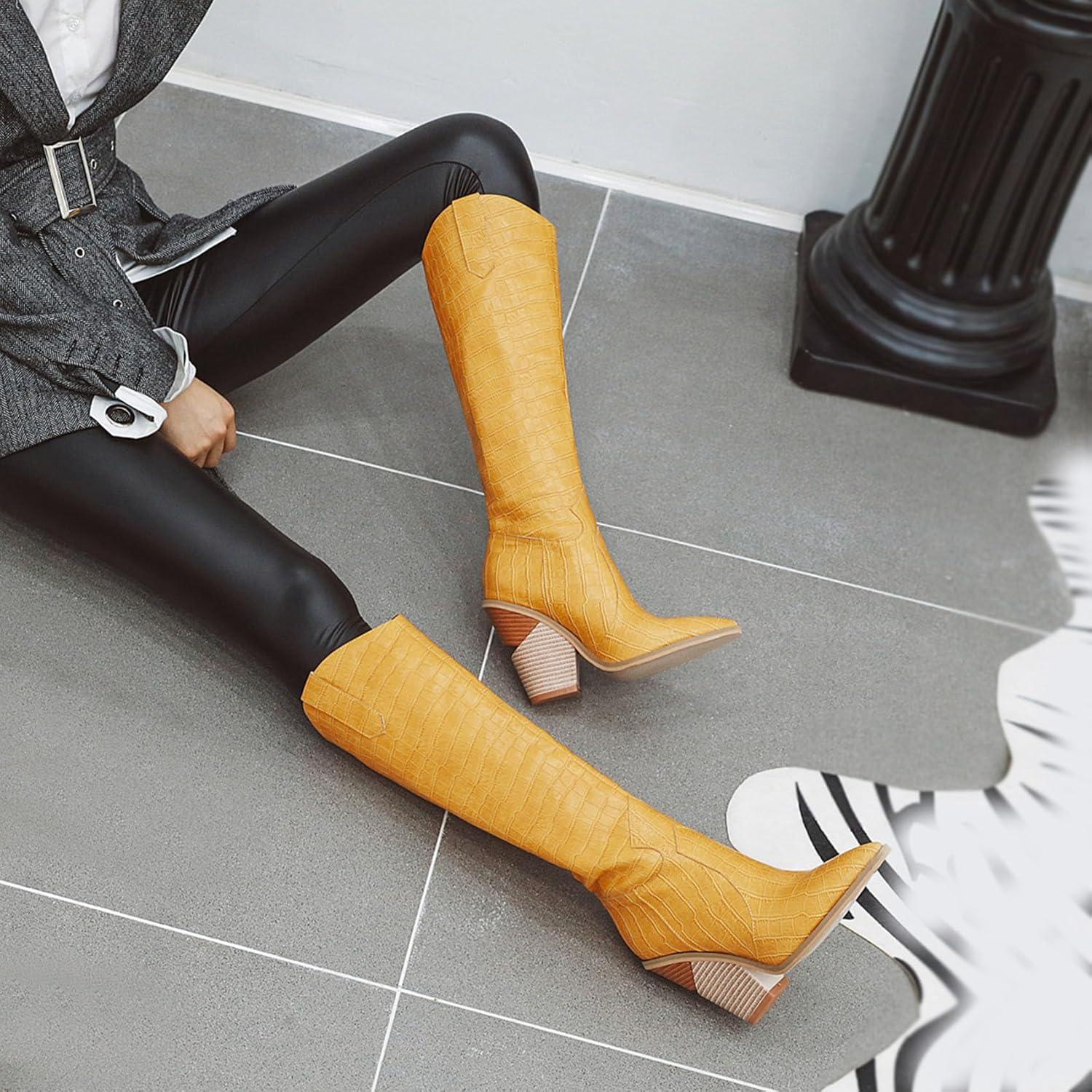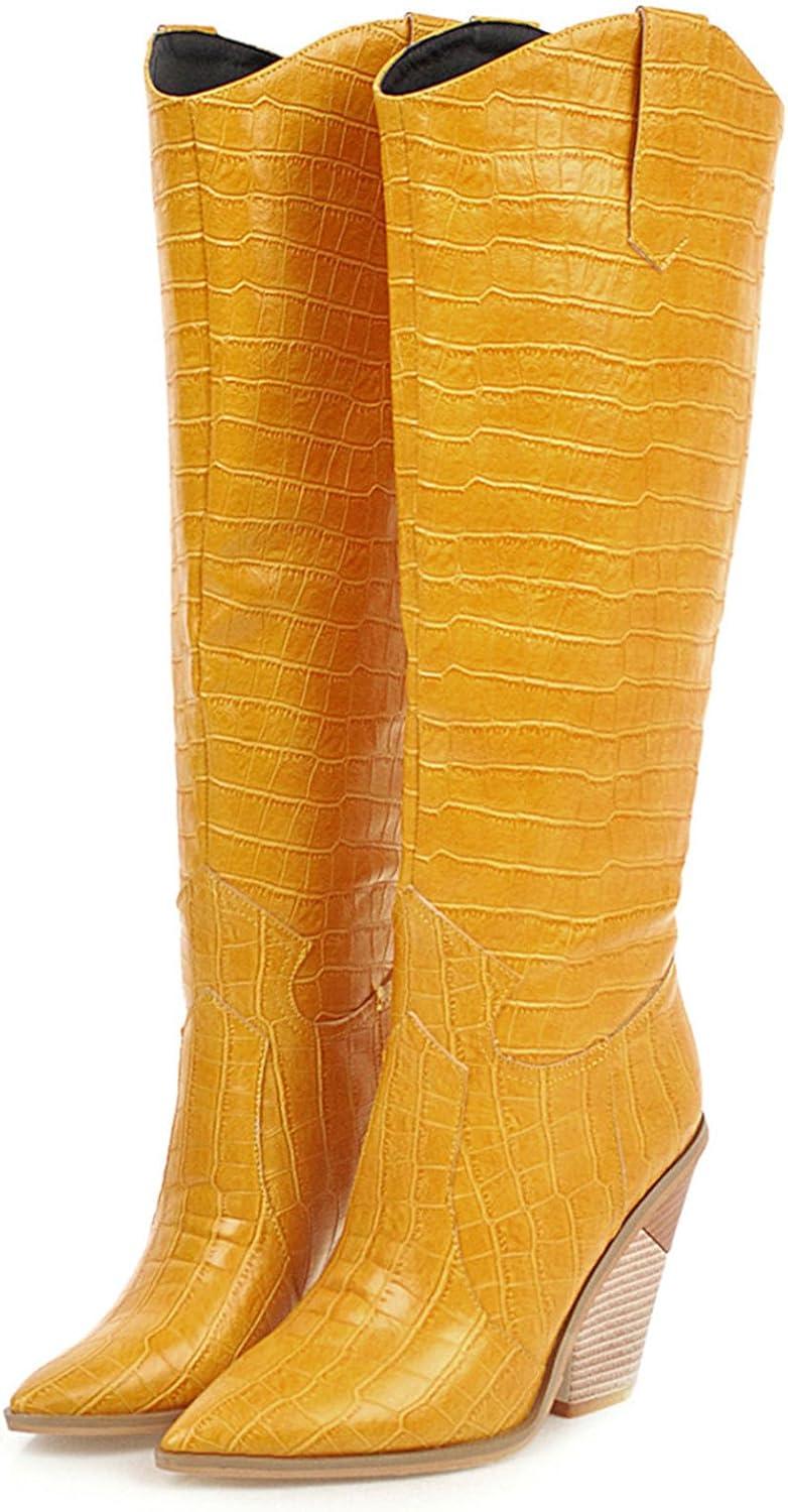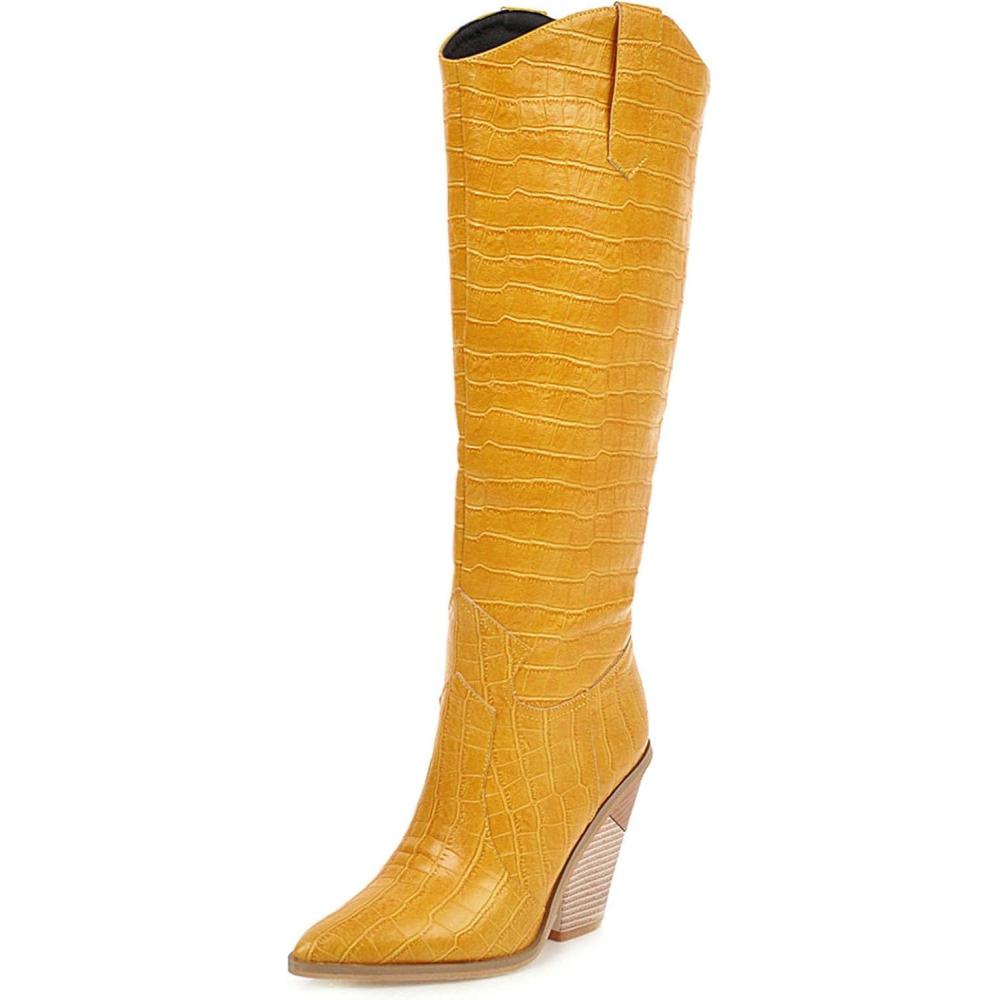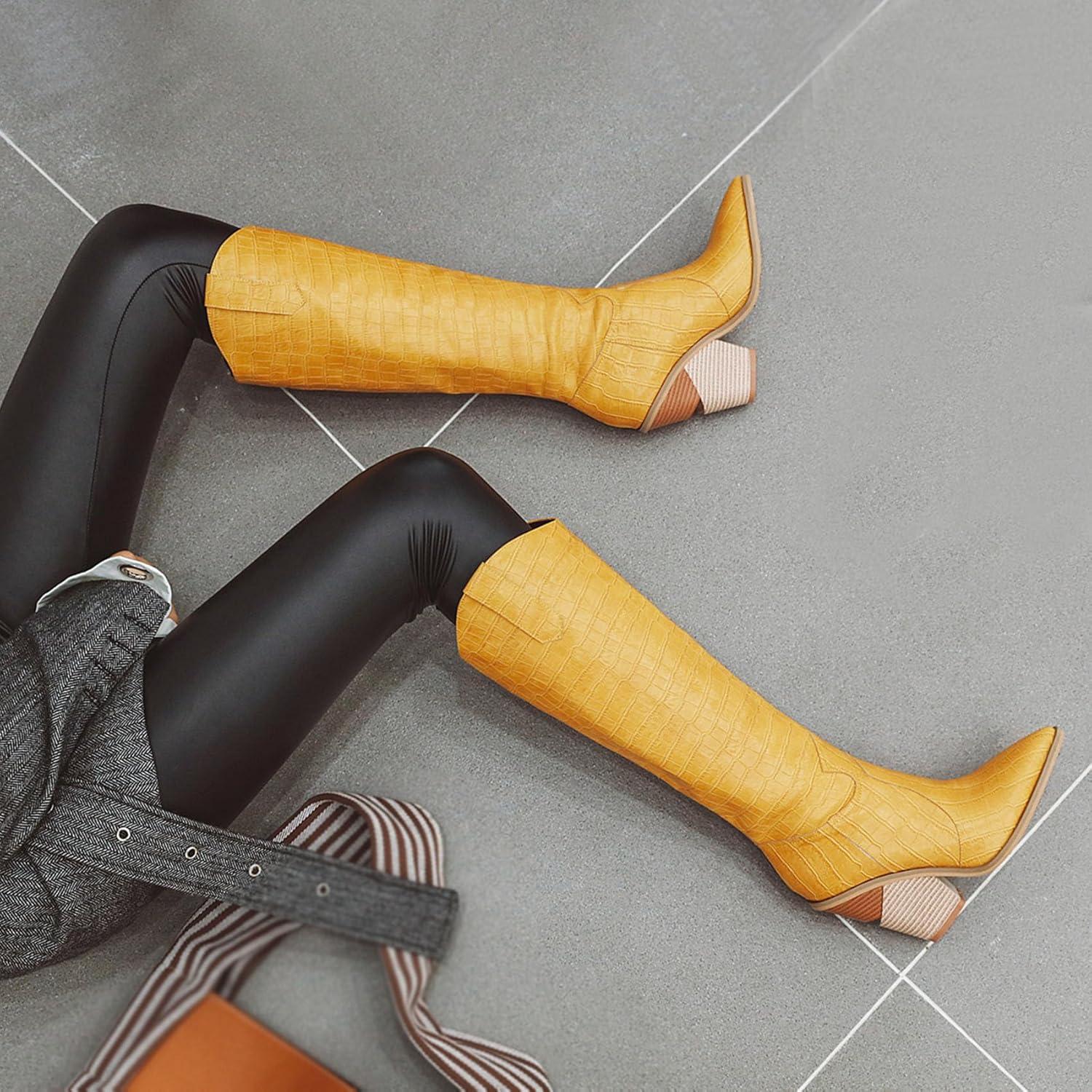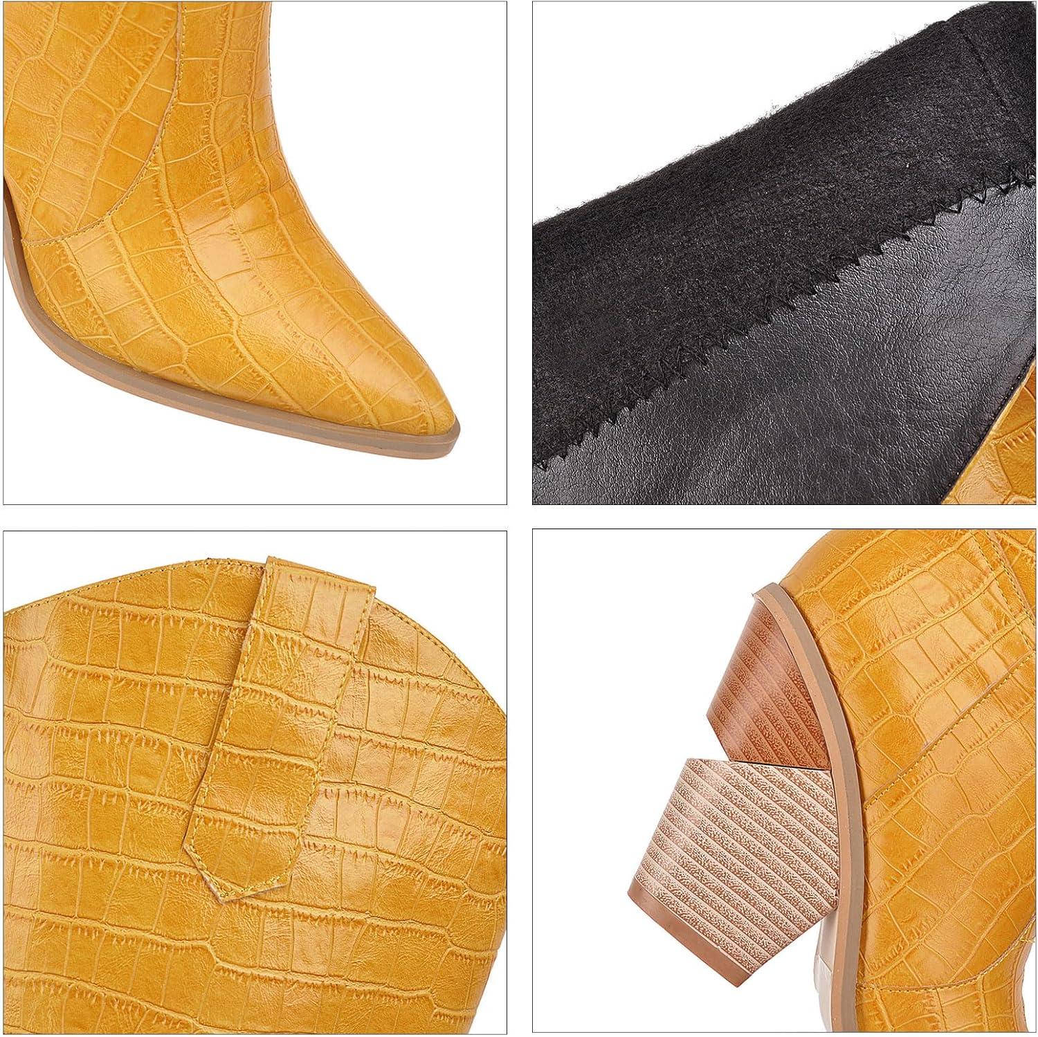 SHEMEE Stacked Chunky Heels Cowboy Boots for Women Pointed Toe Western Cowgirl High Heel Boots(Yellow)