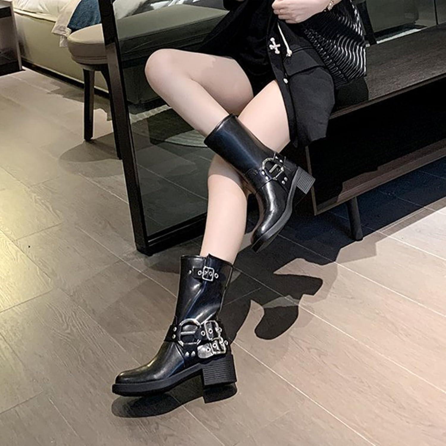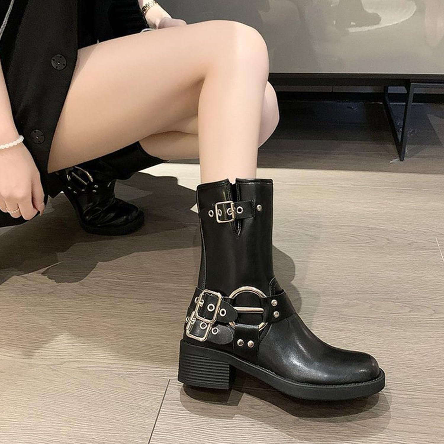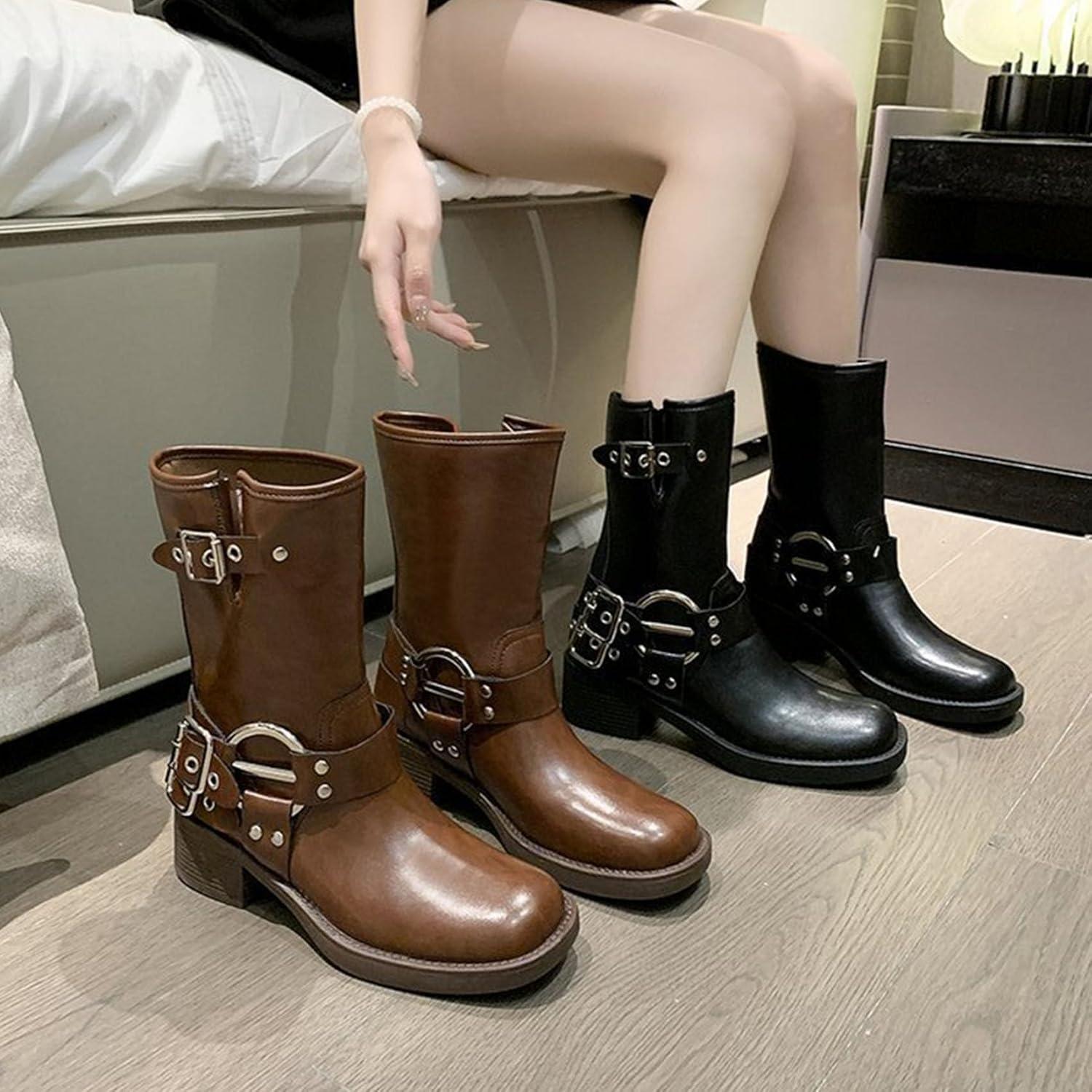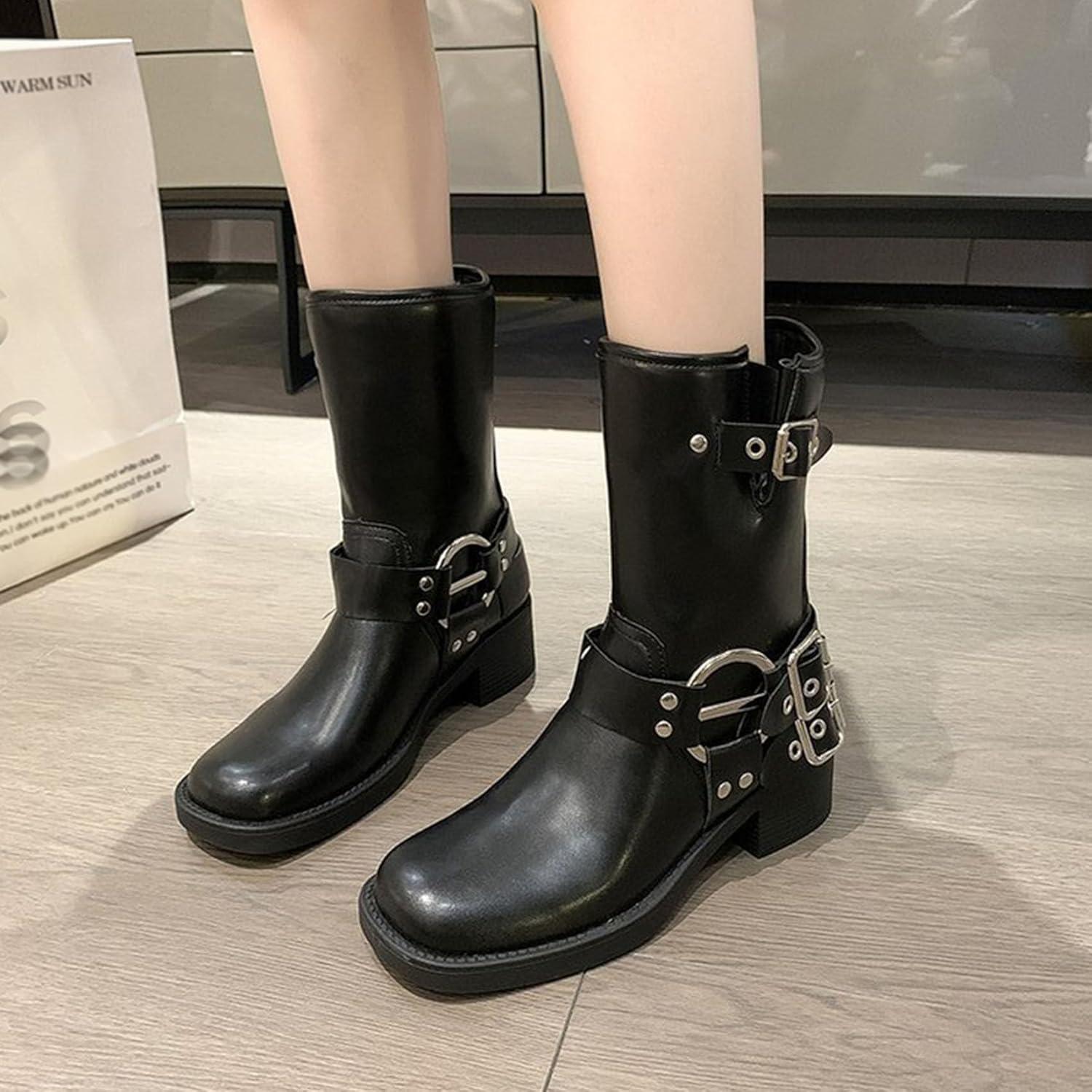 SHEMEE Chunky Block Low Heels Mid-Calf Boots for Women Vintage Square Toe Buckles Biker Riding Boots Y2k Punk Motorcycle Knight Short Ankle Boots Slip-On Shoes
