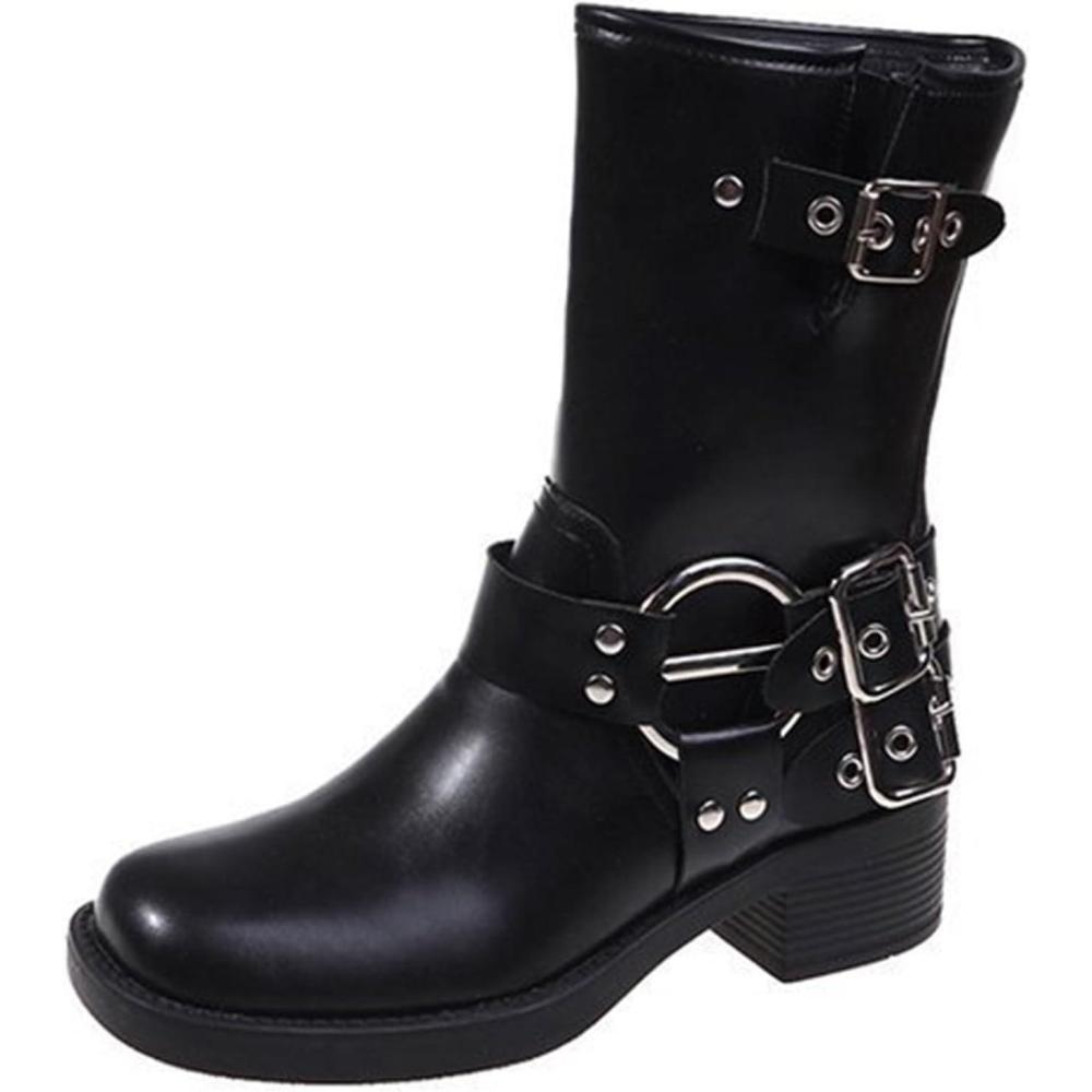 imageSHEMEE Womens Chunky Block Low Heels MidCalf Boots Vintage Square Toe Buckles Biker Riding Boots Punk Motorcycle Knight Ankle BootsBlack