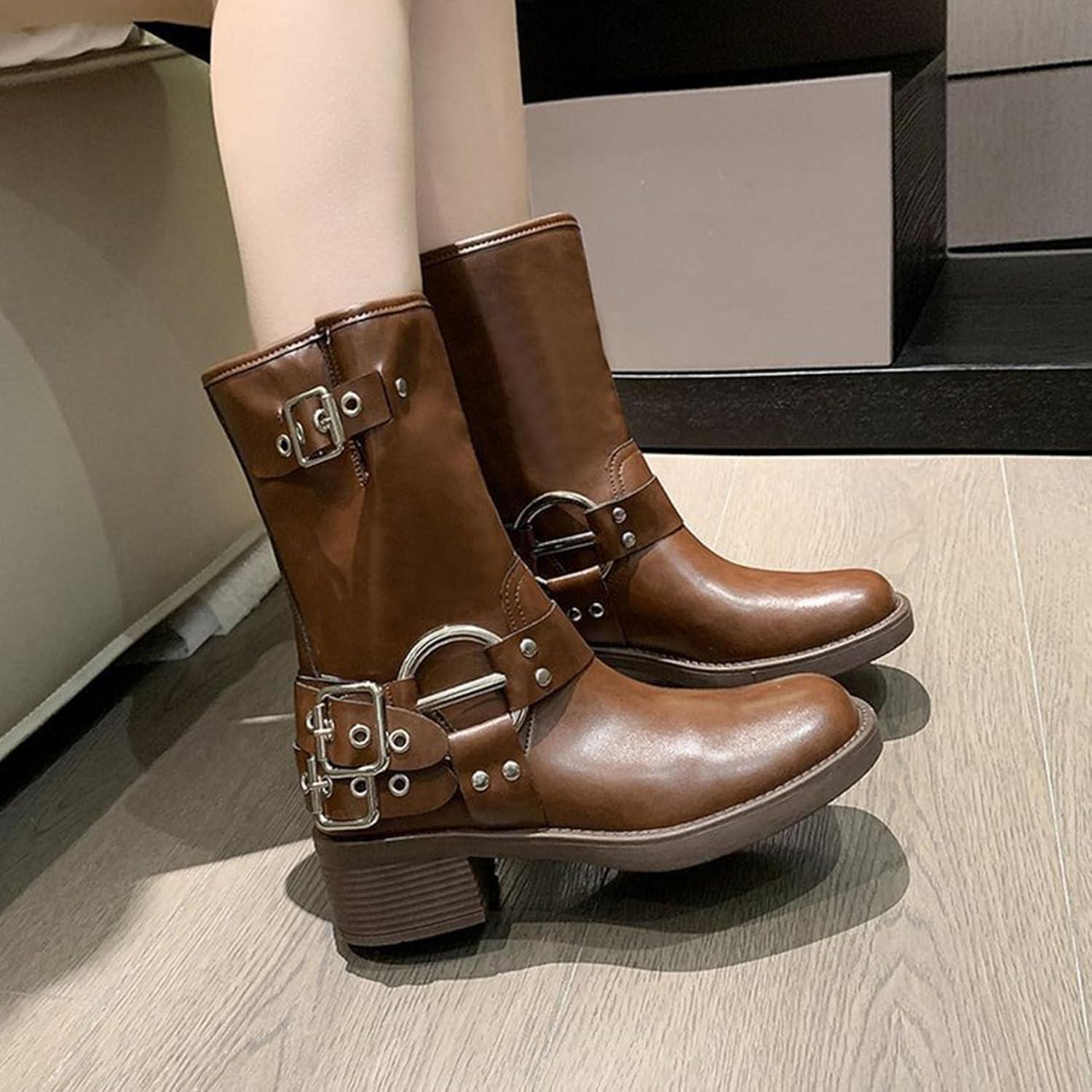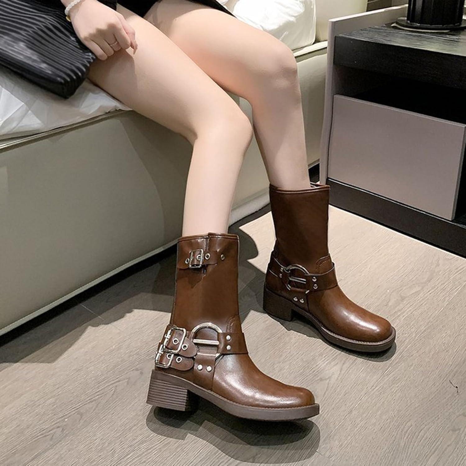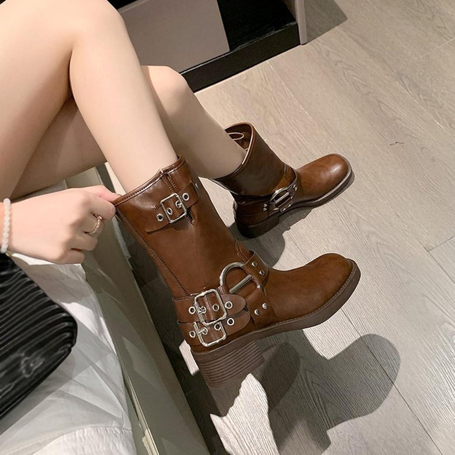 SHEMEE Chunky Block Low Heels Mid-Calf Boots for Women Vintage Square Toe Buckles Biker Riding Boots Y2k Punk Motorcycle Knight Short Ankle Boots Slip-On Shoes