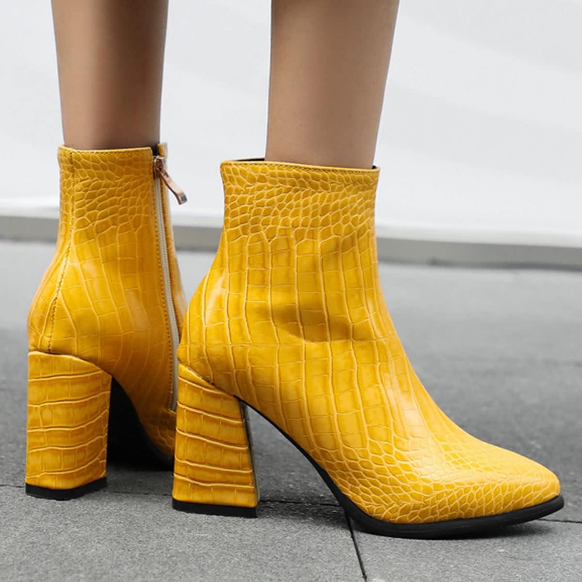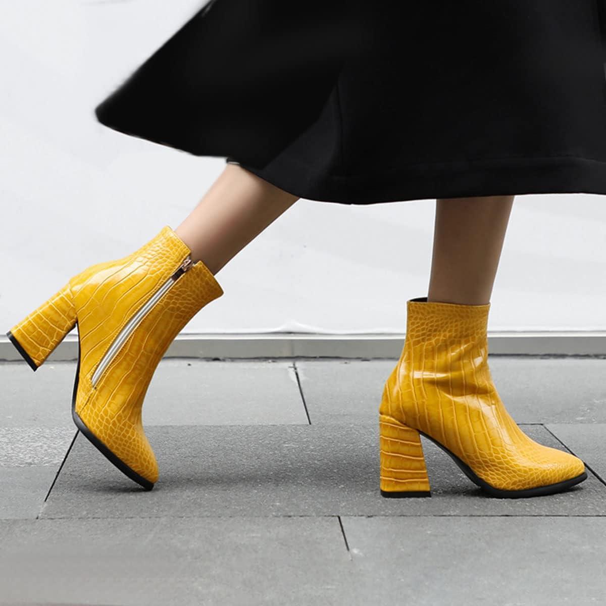 SHEMEE Women's Chunky High Heel Ankle Booties Block Heeled Pointed Toe Side Zipper Short Boots Shoes(Yellow)
