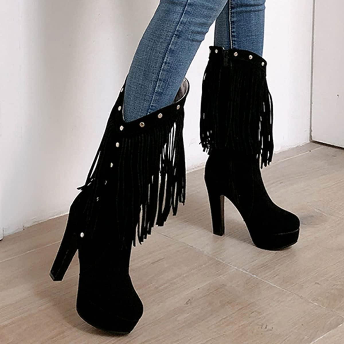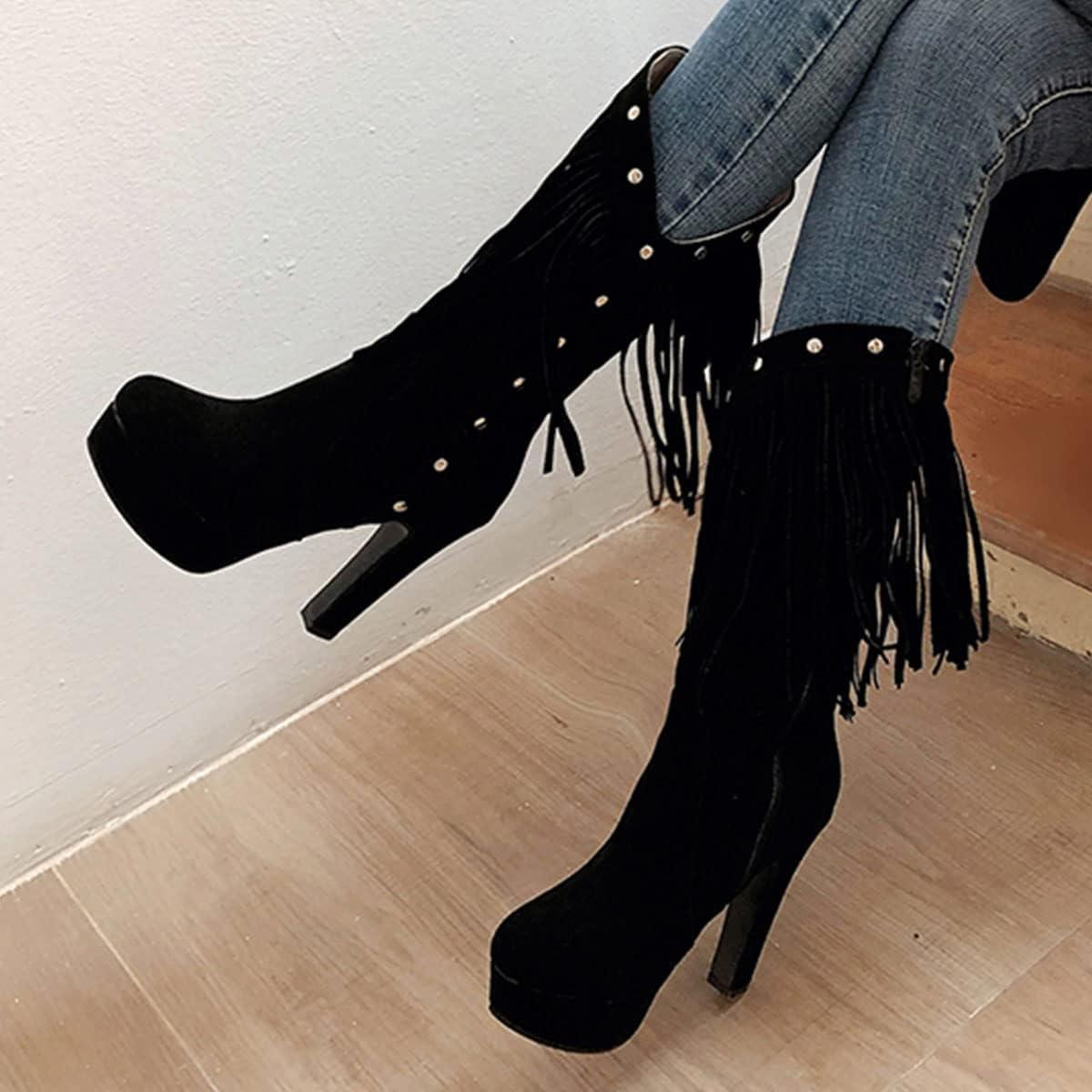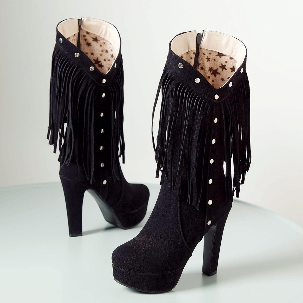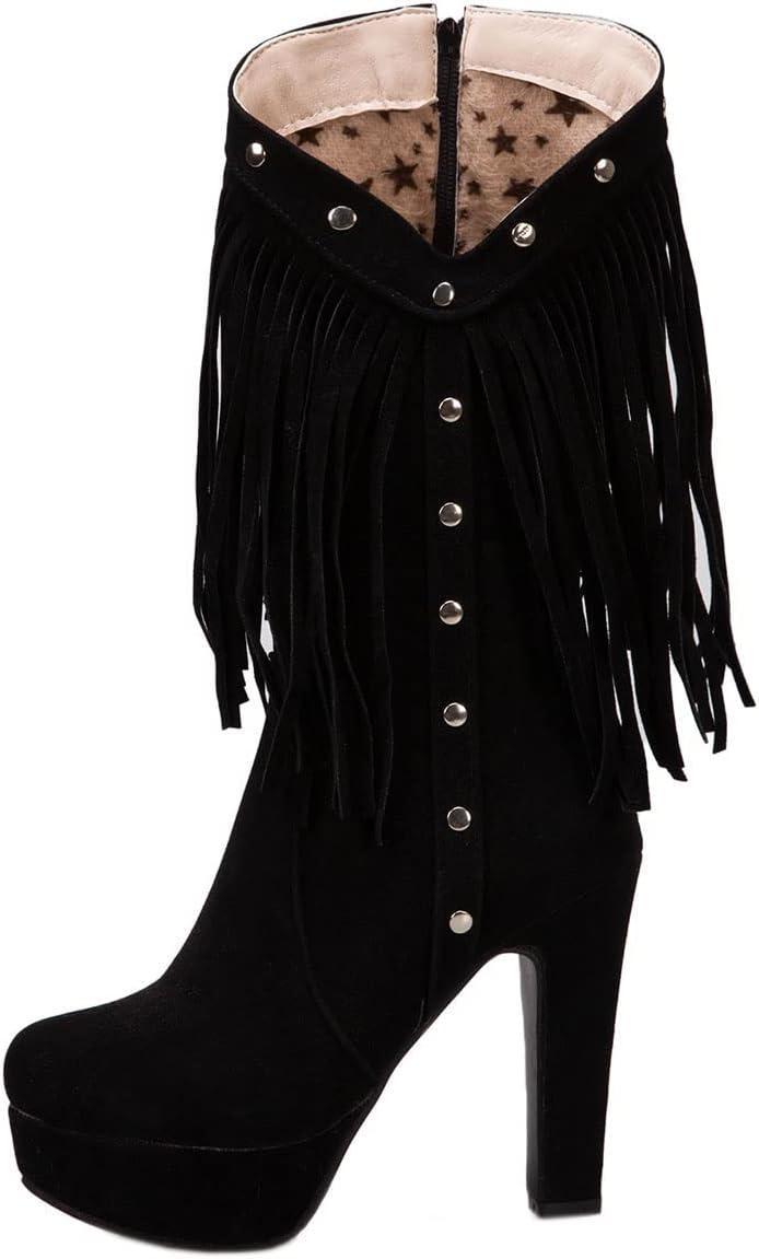 SHEMEE Women's Chunky High Heel Platform Mid Calf Boots Tassel Side Zipper Round Toe Boot Shoes(Black)