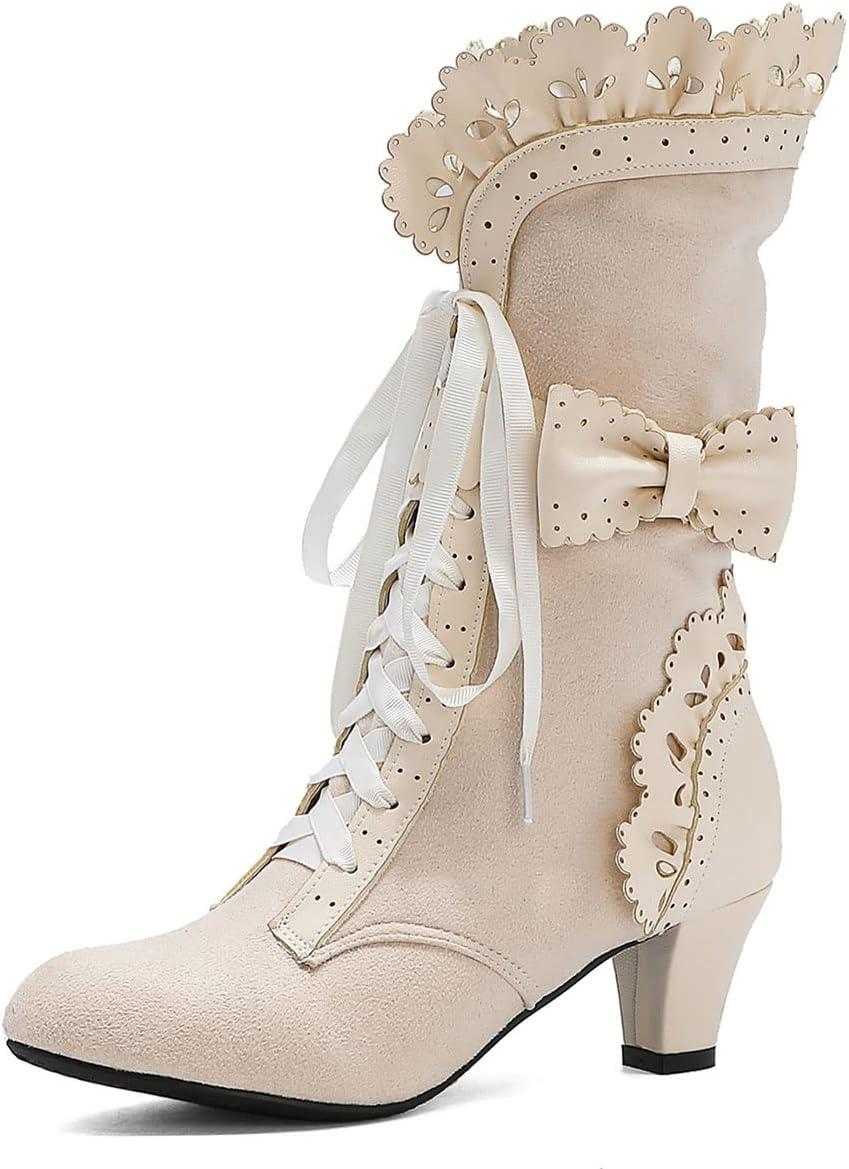 Womens Cute Lolita Lace Up Ankle High Boots Faux Suede Chunky Kitten Heel Booties Kawaii Cosplay Shoes with Bow