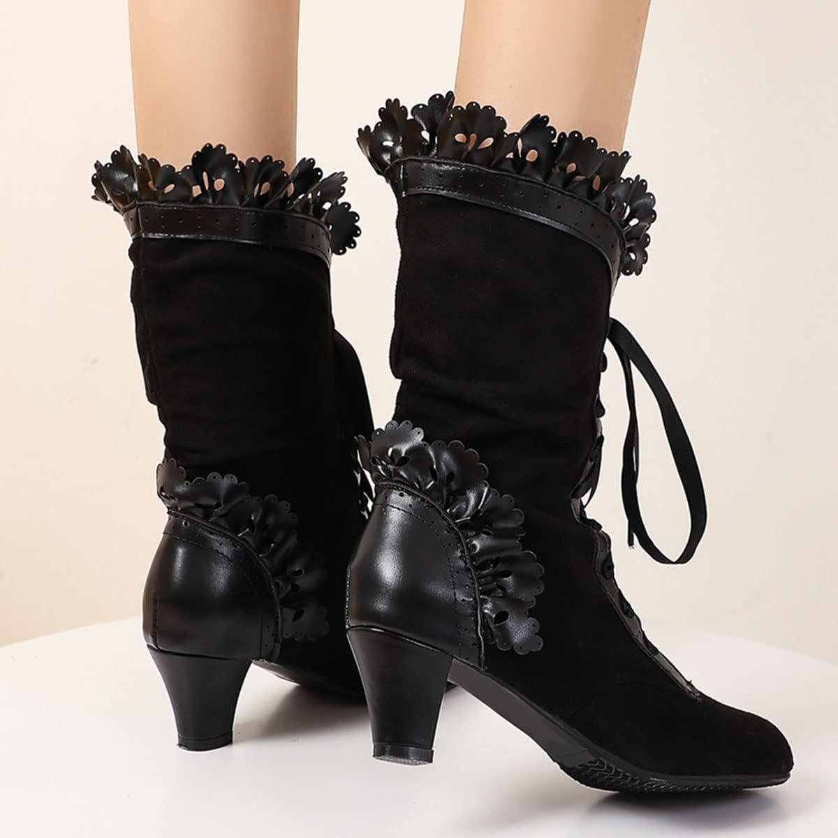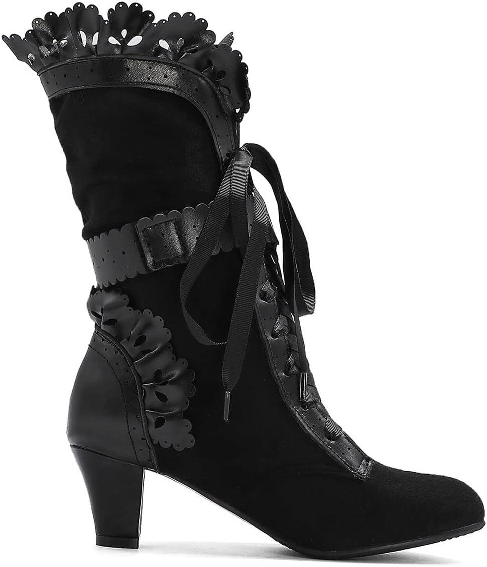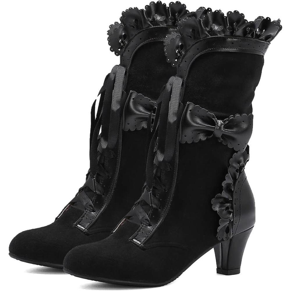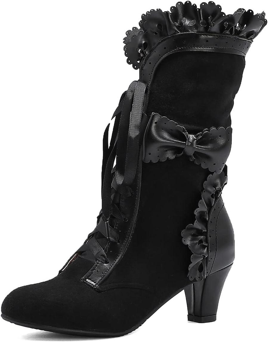 Womens Cute Lolita Lace Up Ankle High Boots Faux Suede Chunky Kitten Heel Booties Kawaii Cosplay Shoes with Bow