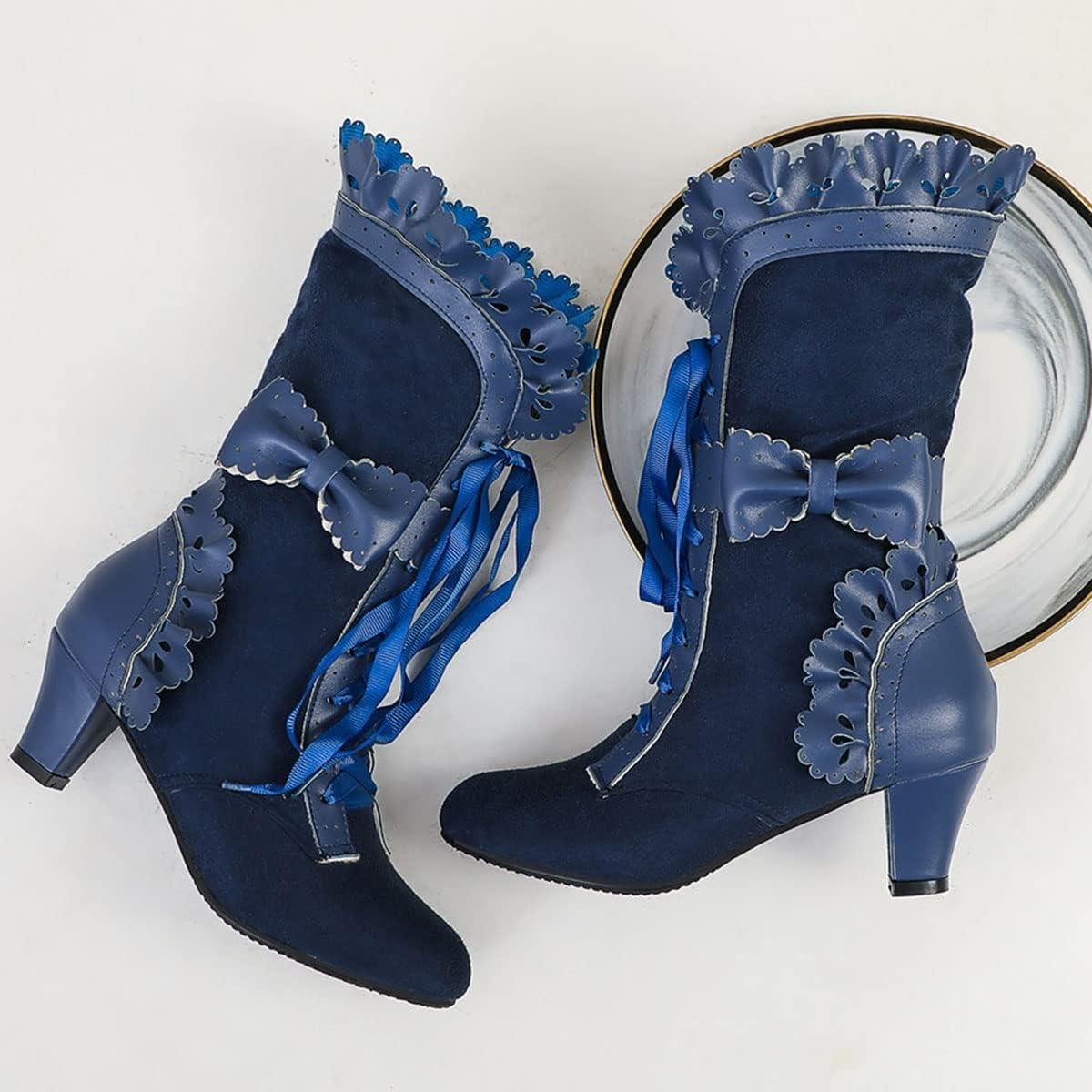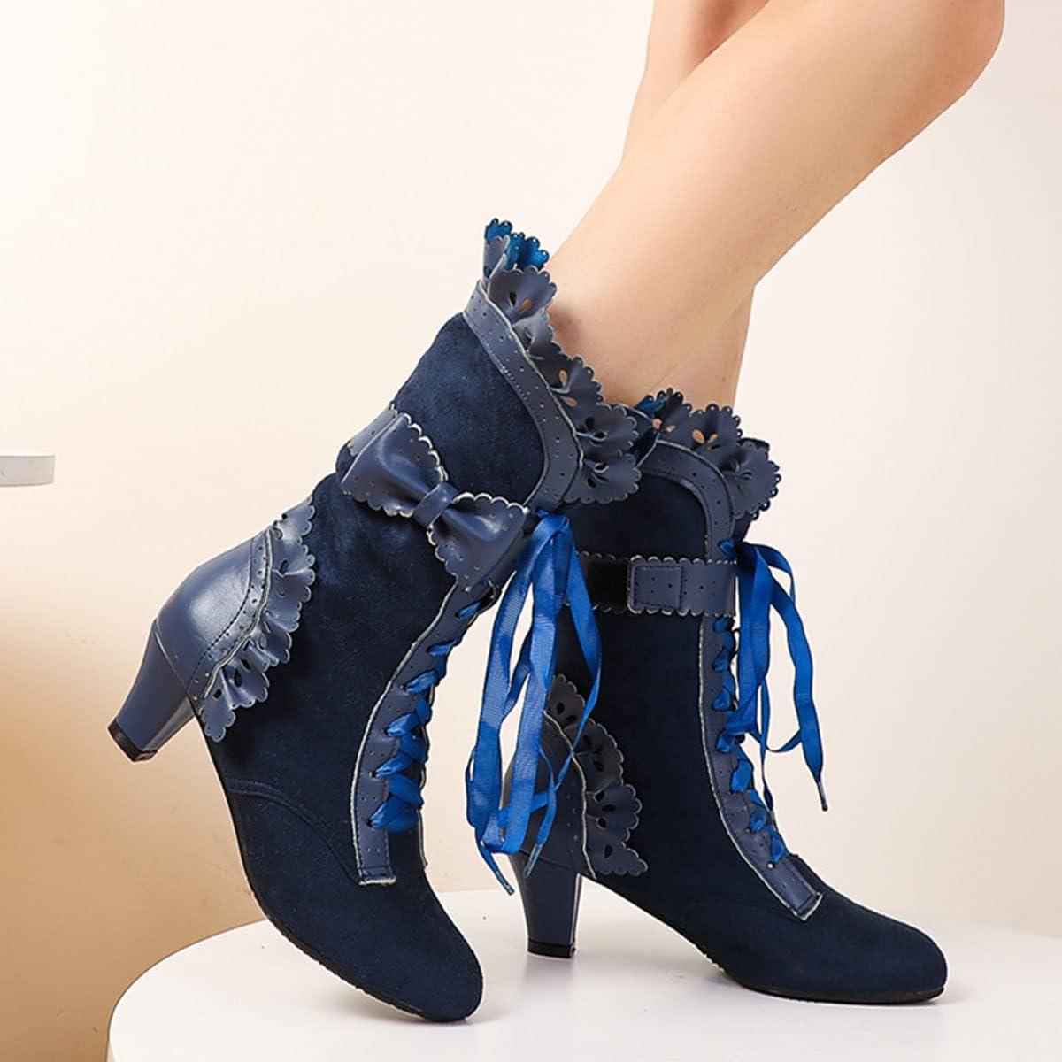 SHEMEE Women's Cute Rockabilly Lolita Boots Lace Up Kitten Heels Ankle Boots Faux Suede Kawaii Cosplay Bow Short Boots(Navy Blue)