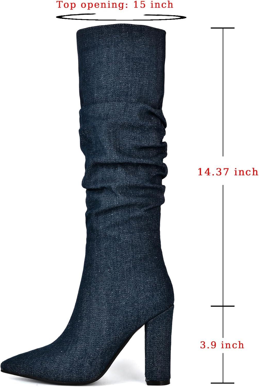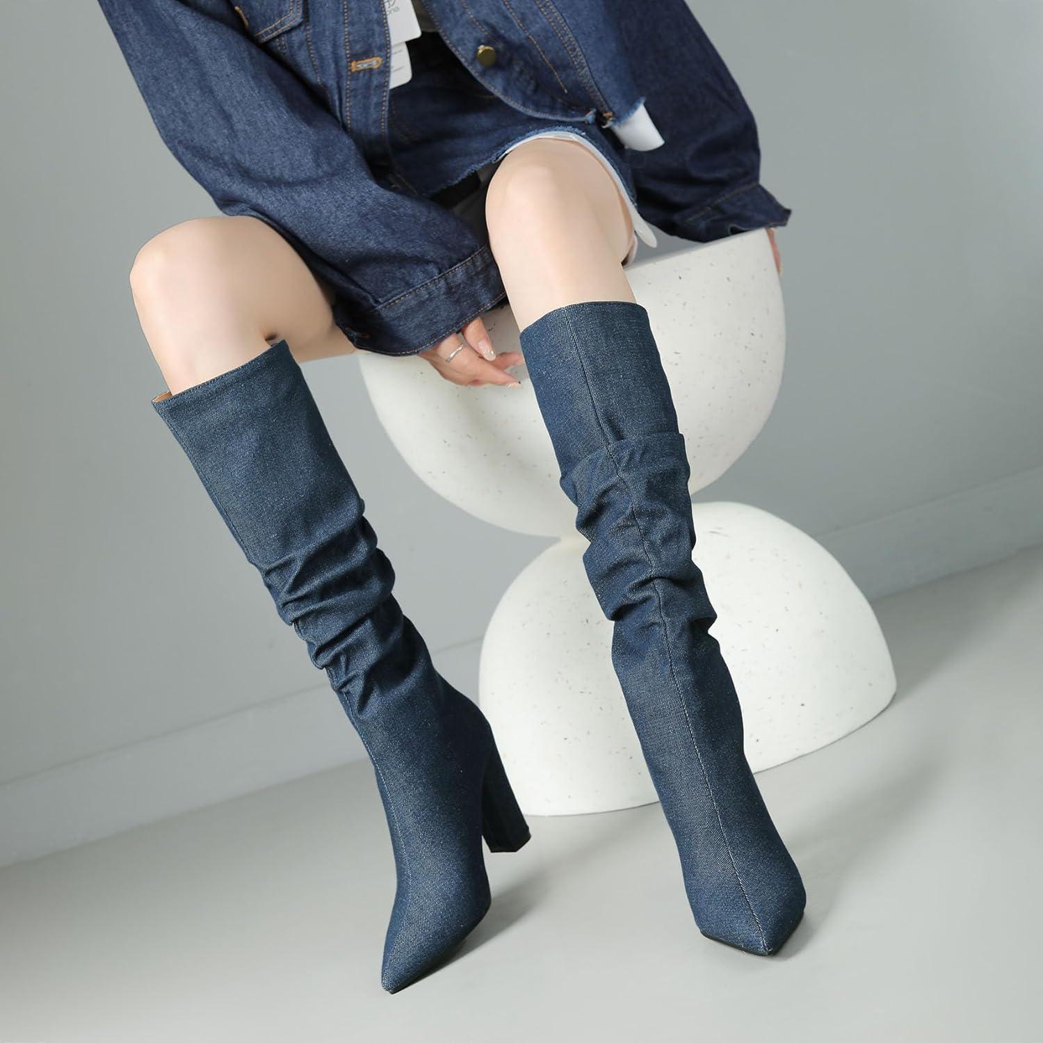 SHEMEE Women's Denim Knee High Boots Kitten Heels Pointed Toe Dress Jeans Mid-Calf Boots Zipper Fashion Tall Boots
