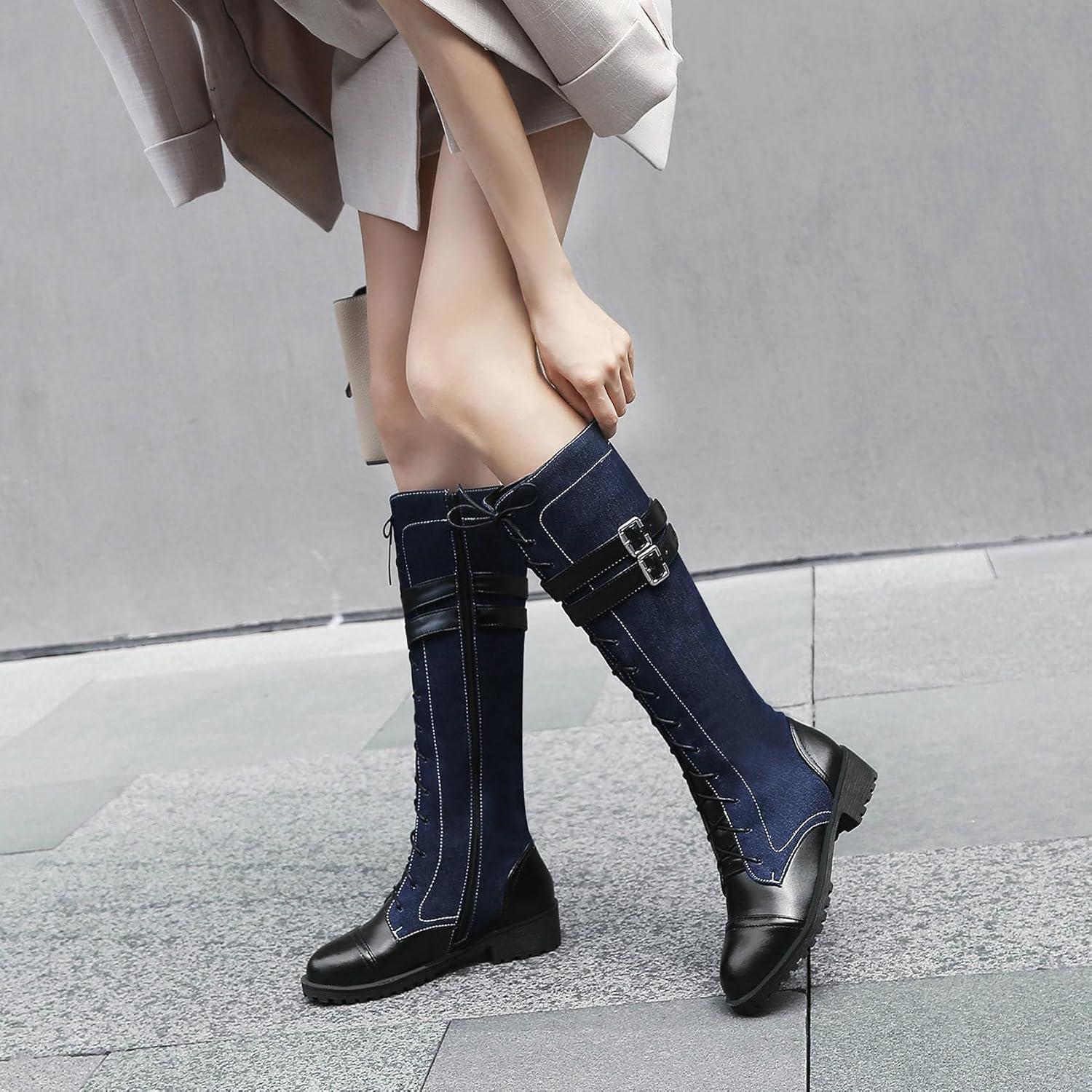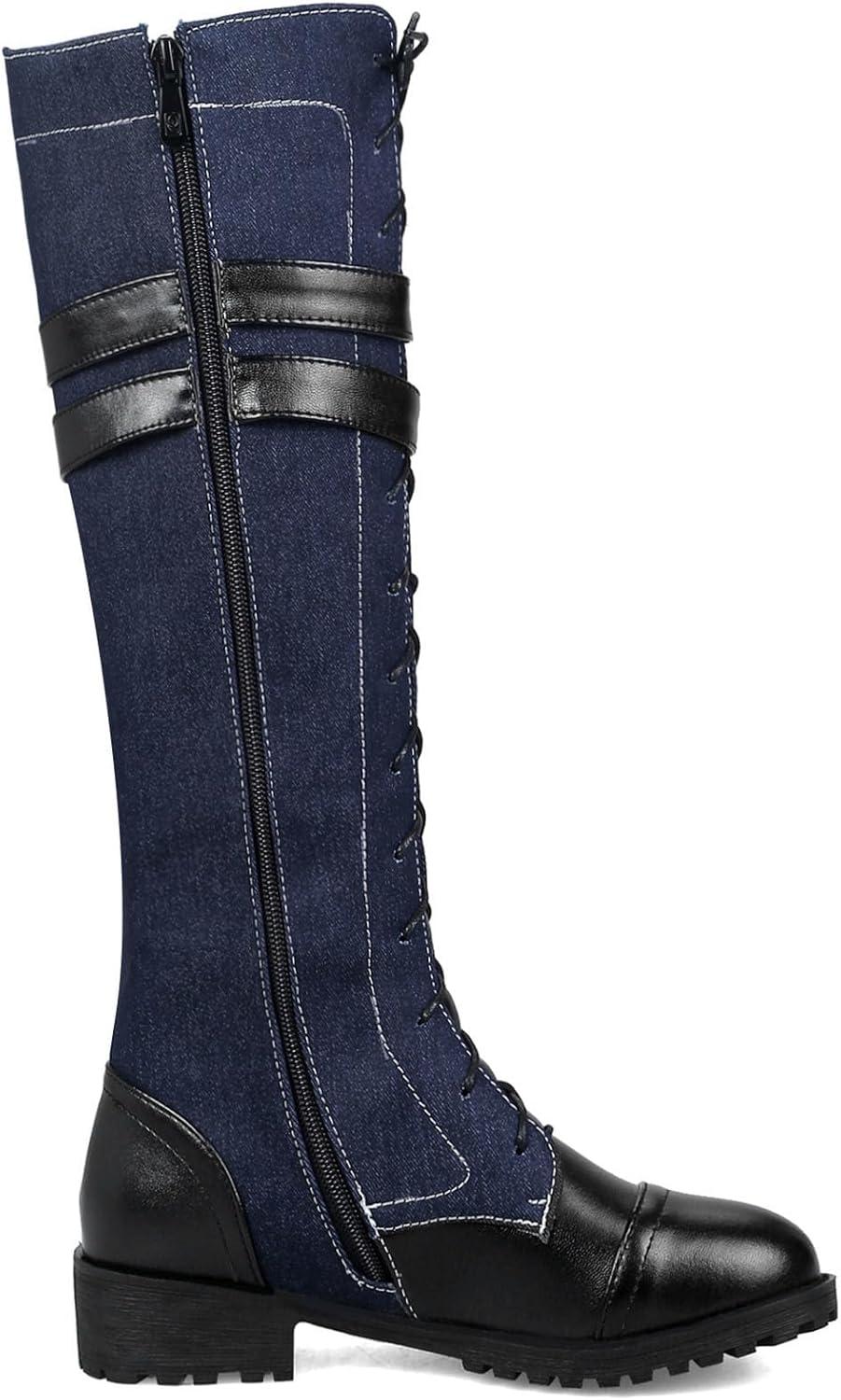 SHEMEE Women’s Flat Combat Boot Buckle Riding Knee High Boots Lace Up Chunky Low Heels Gothic Motorcycle Boots with Inside Zipper(Black Patchwork Denim)