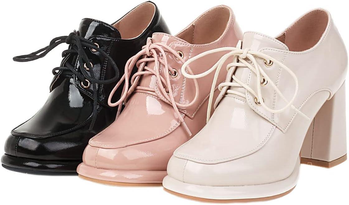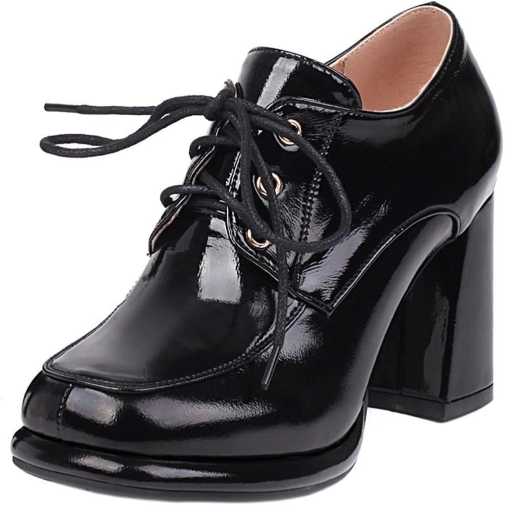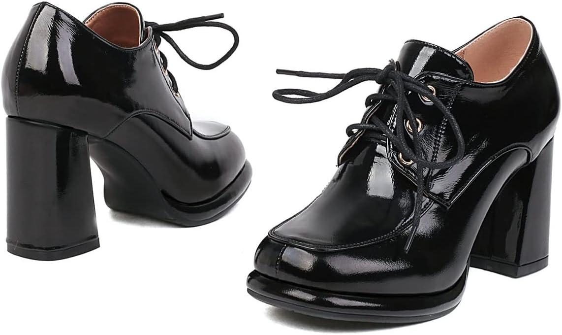 Women's Patent Leather Platform Chunky Heeled Pumps Lace Up Round Toe Block High Heels Dress Shoes