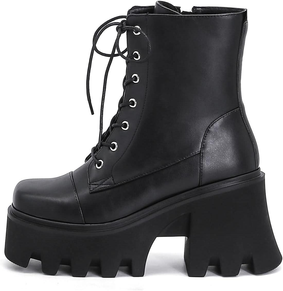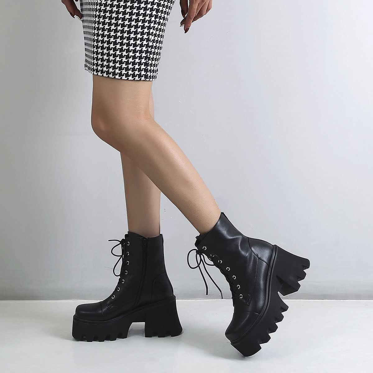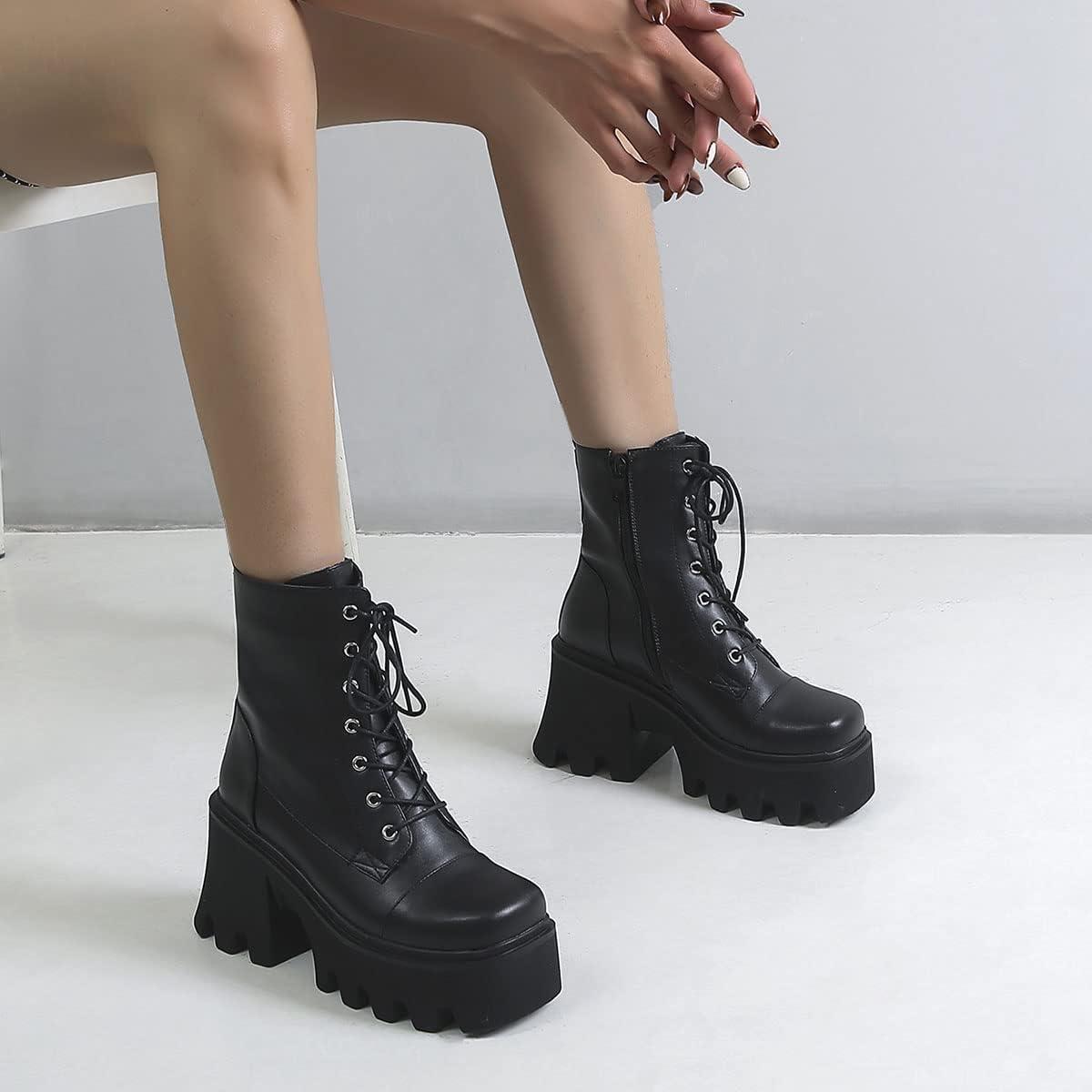 Women's Platform Chunky Ankle Boots Round Toe Lace Up Block High Heels Combat Booties Gothic Shoes