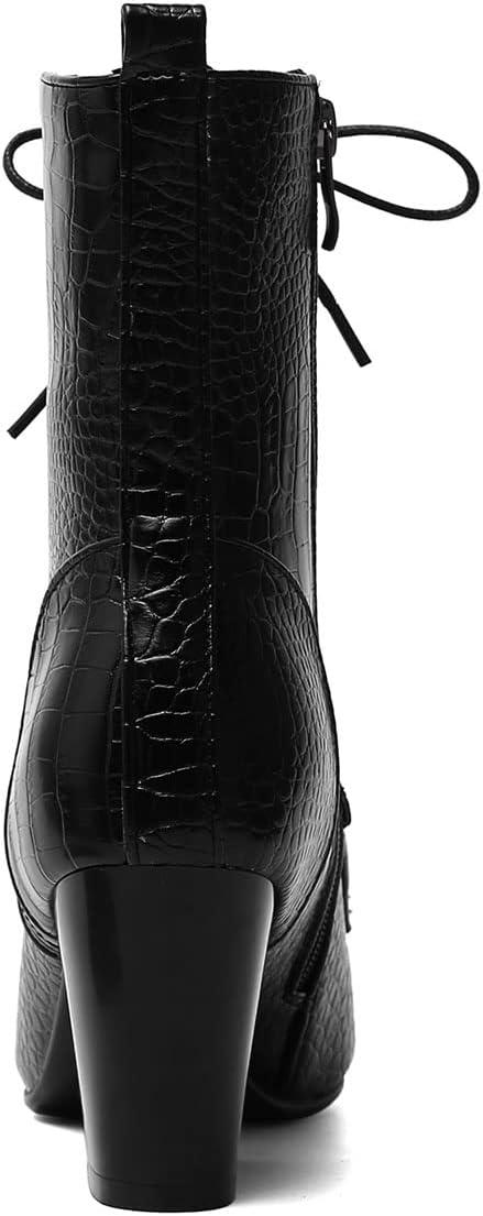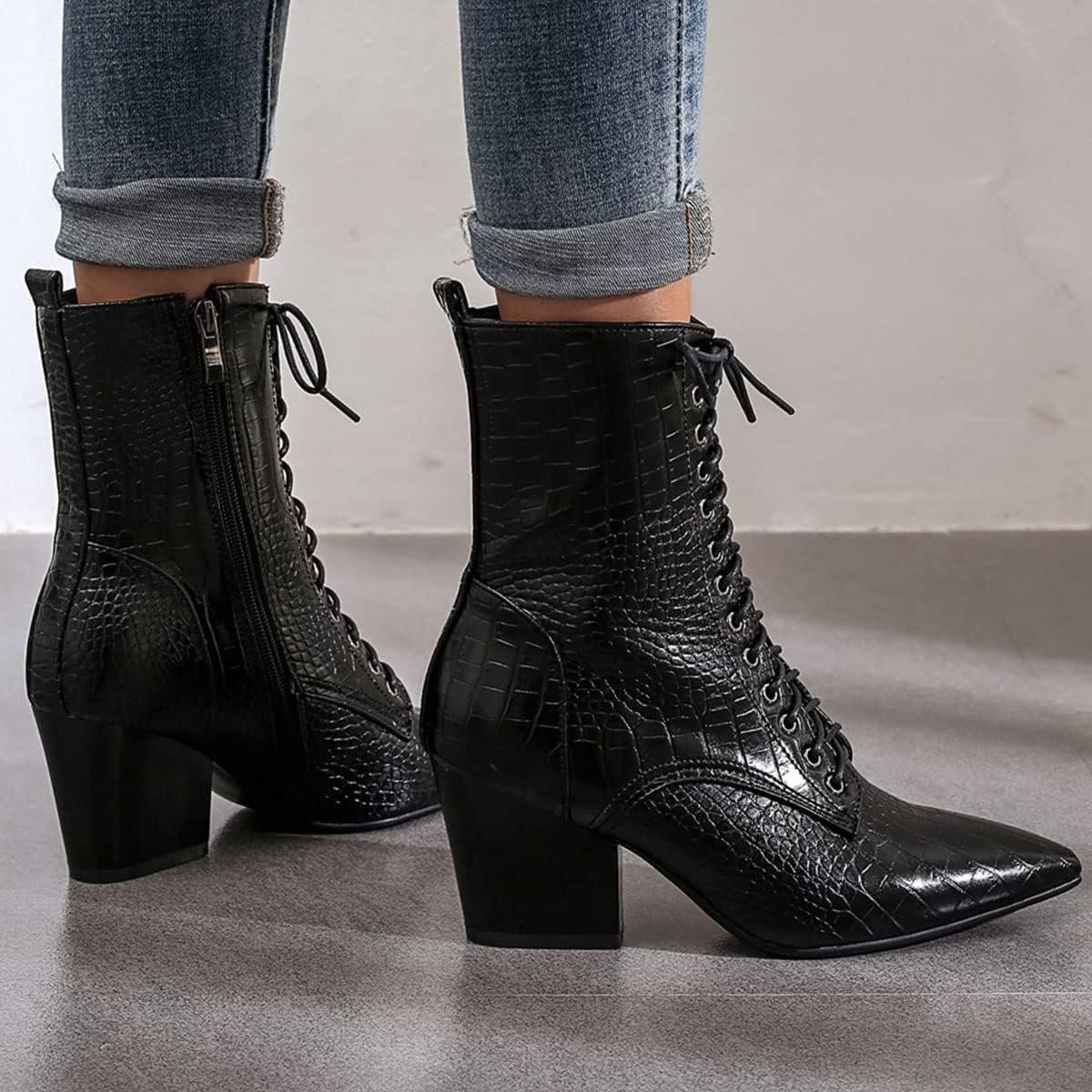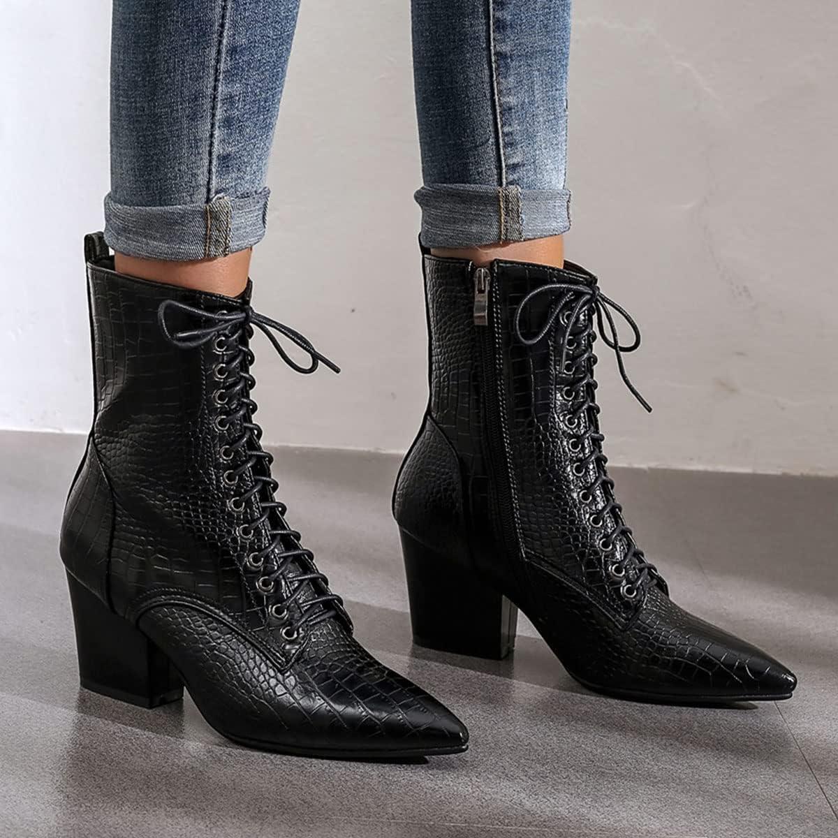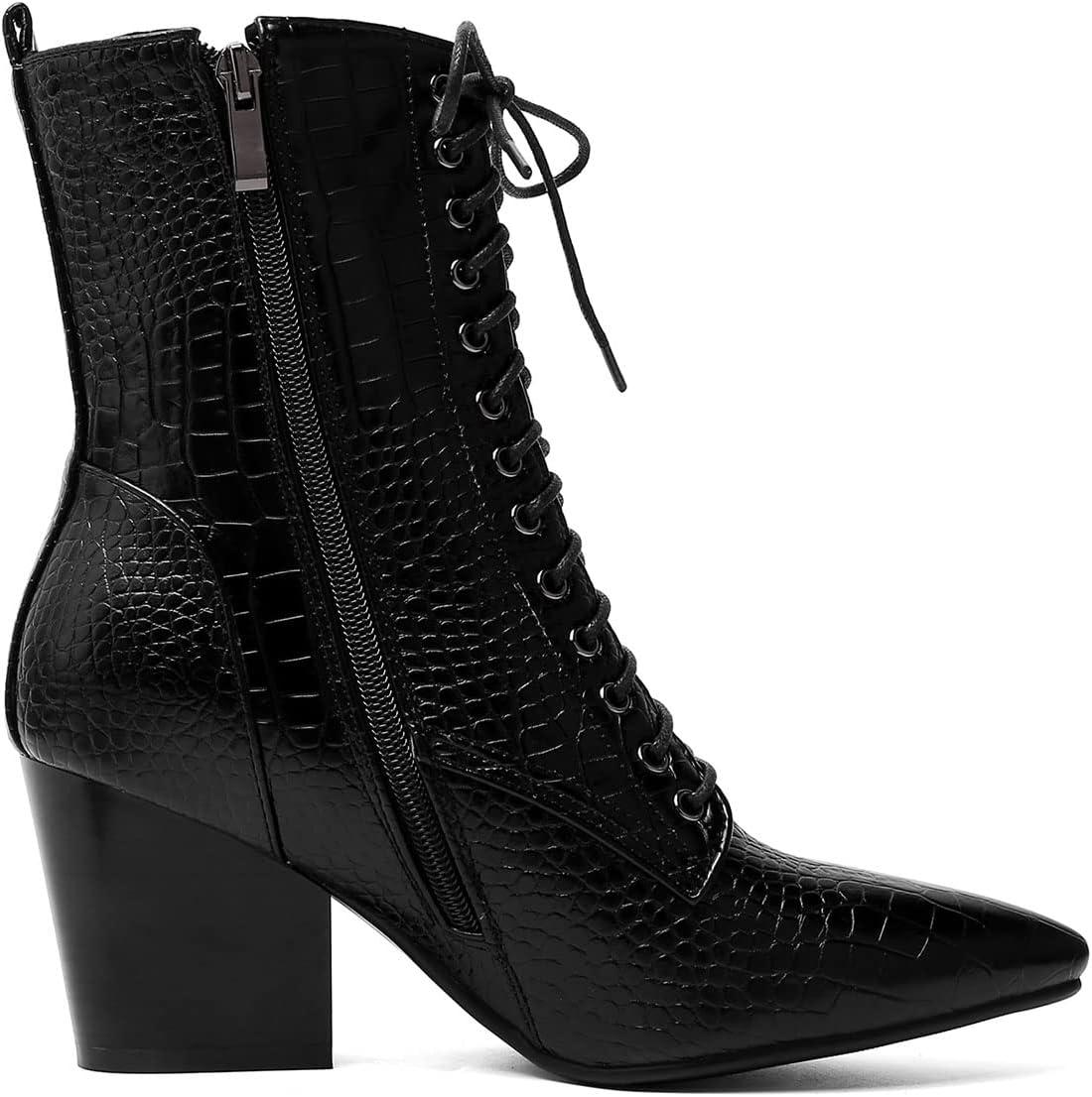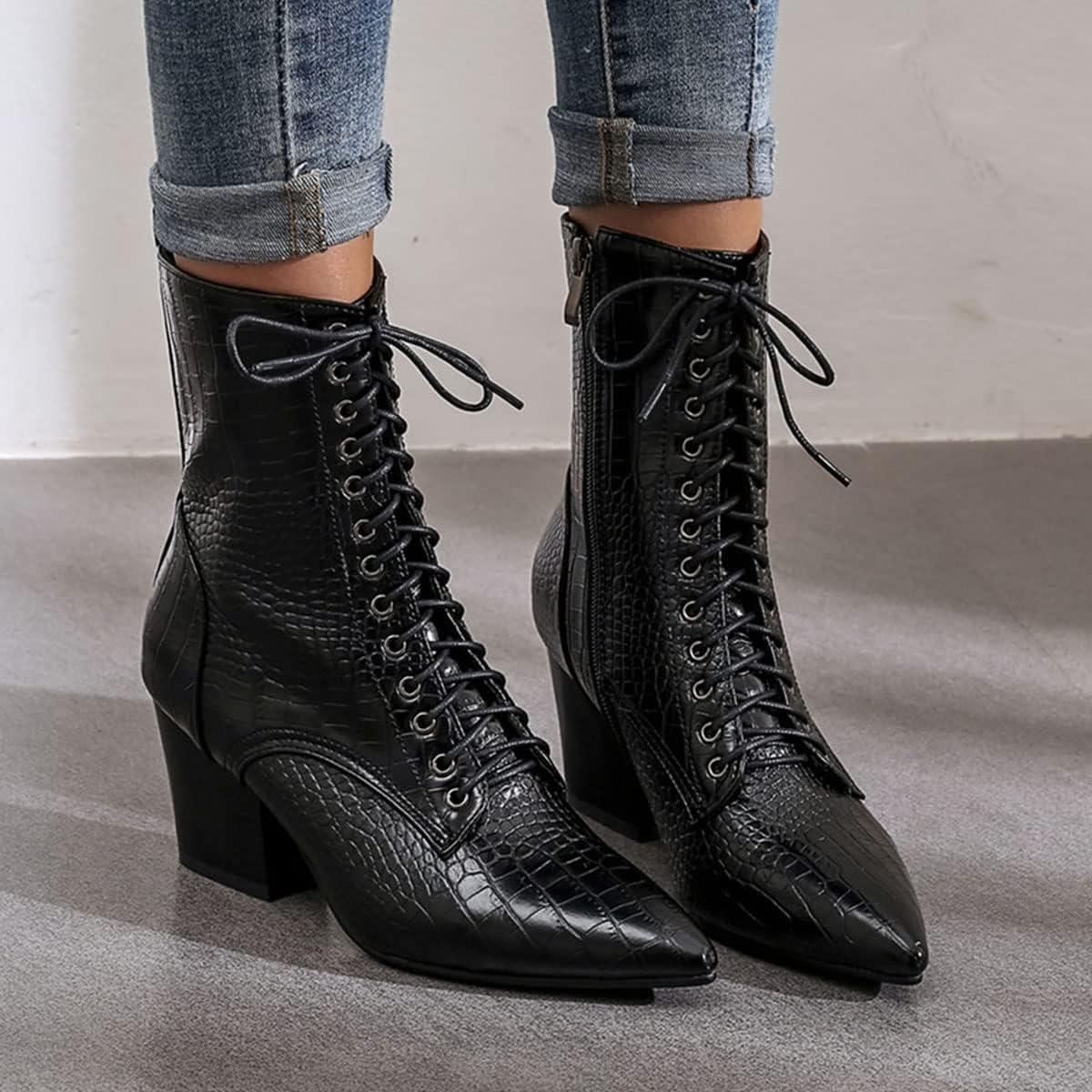 Womens Pointed Toe Chunky High Heels Ankle Boots Lace Up Block Heel Booties with Side-zip