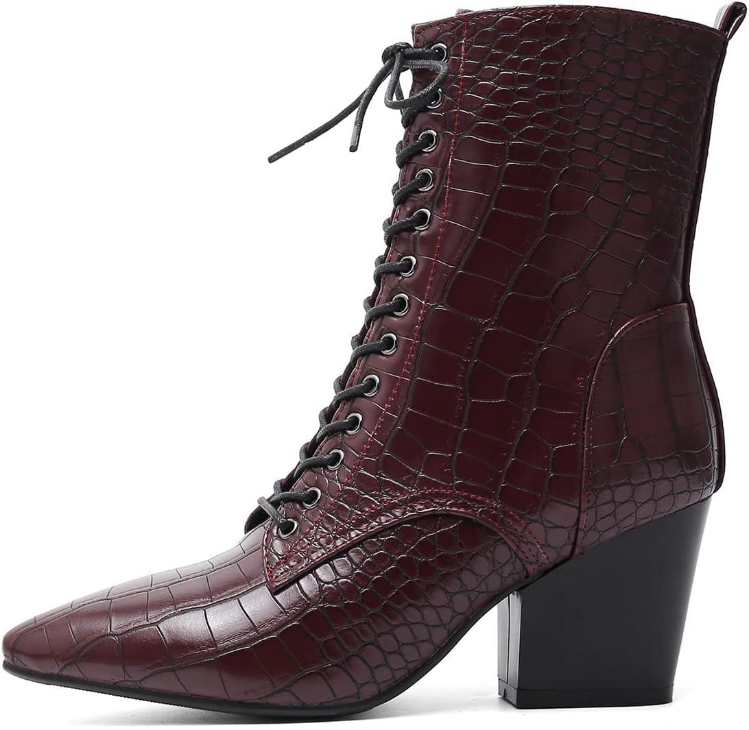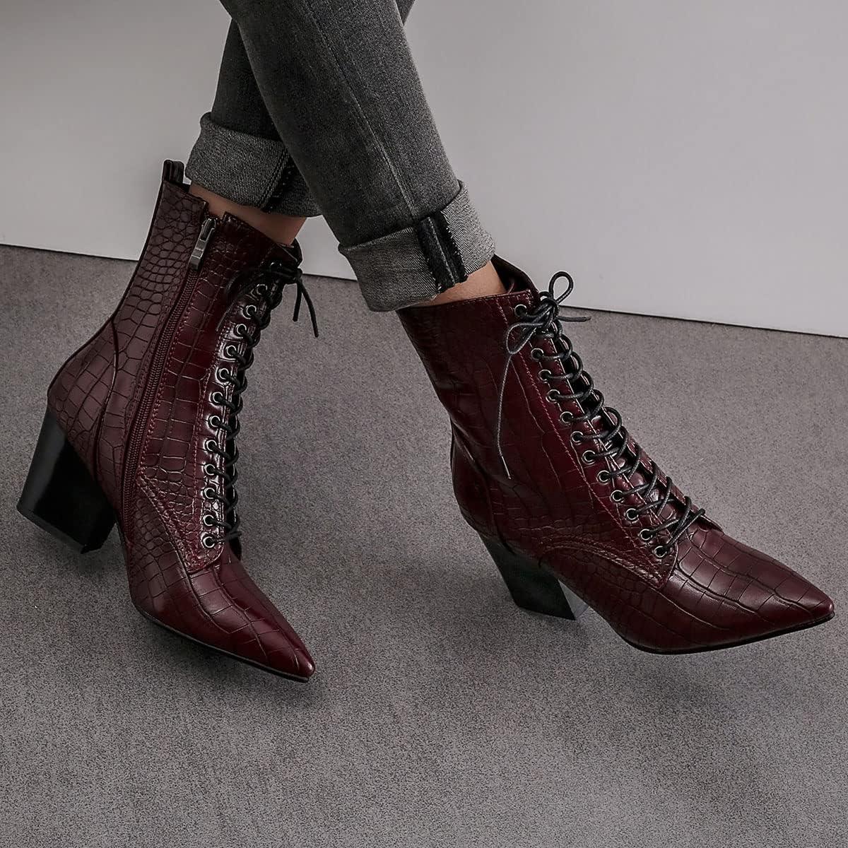 SHEMEE Women’s Pointed Toe Chunky High Heels Booties Lace Up Block Heel Ankle Boots with Side Zipper(Burgundy)