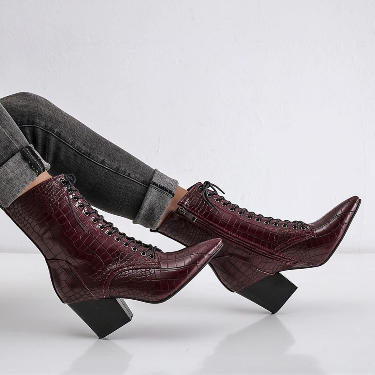 Womens Pointed Toe Chunky High Heels Ankle Boots Lace Up Block Heel Booties with Side-zip