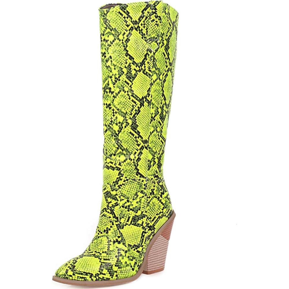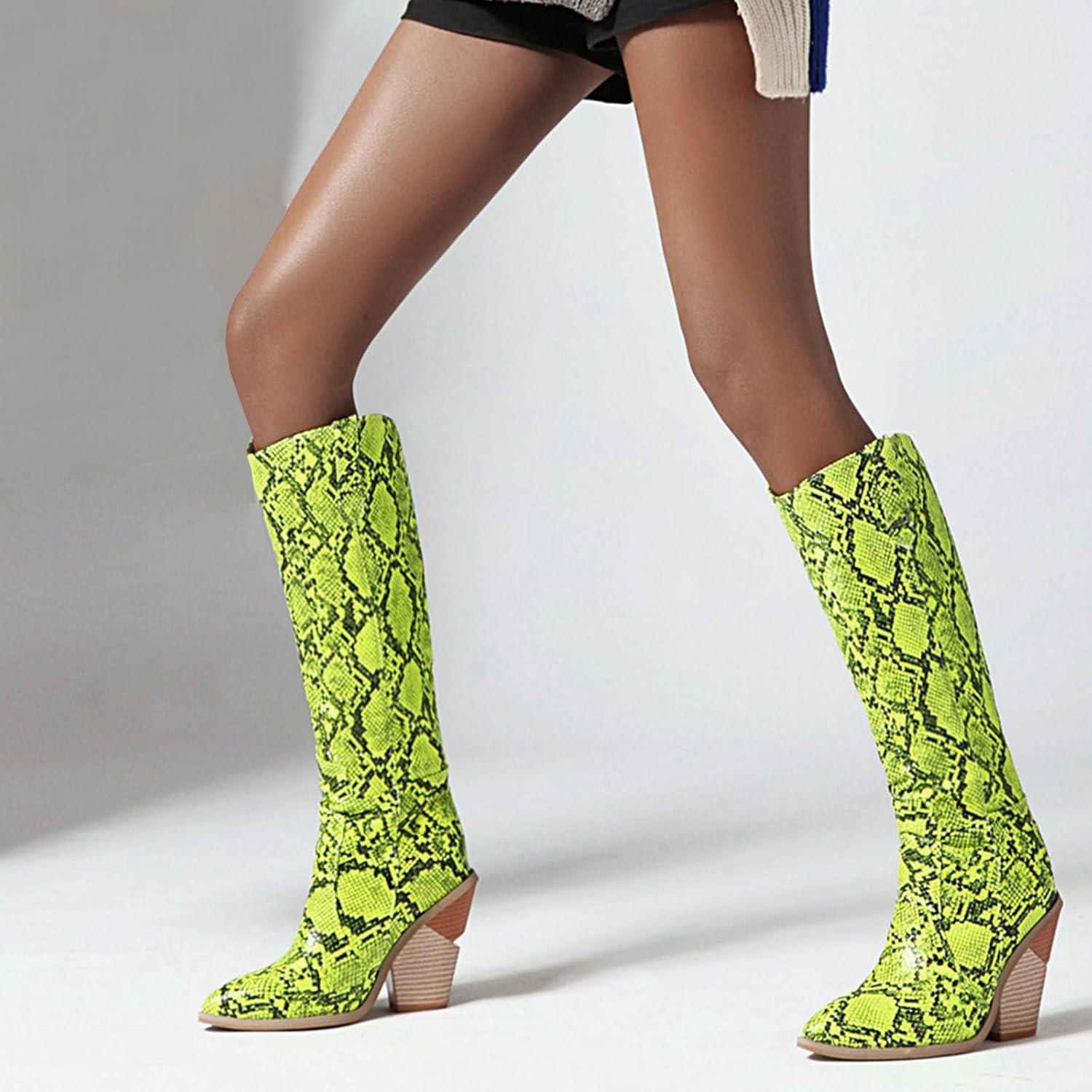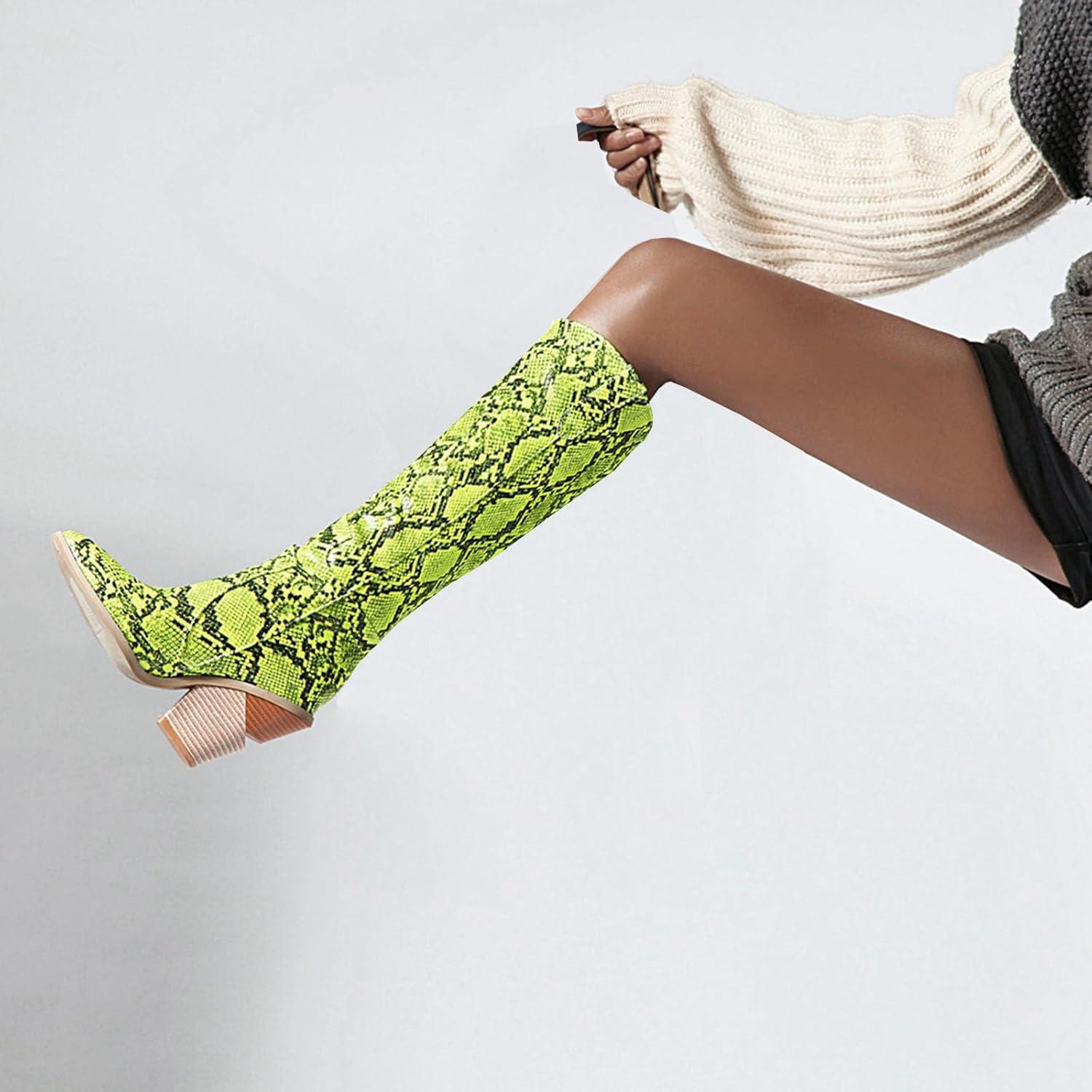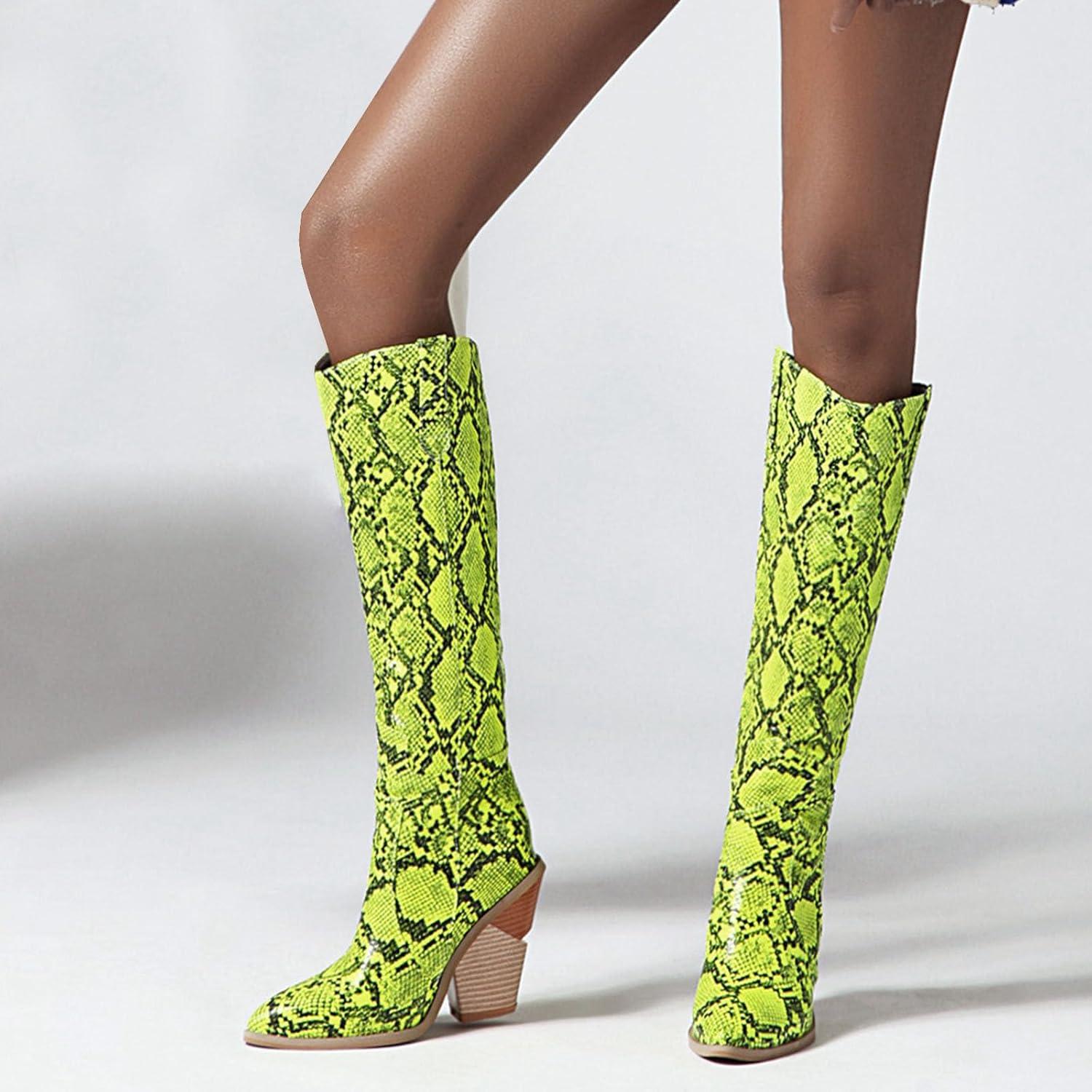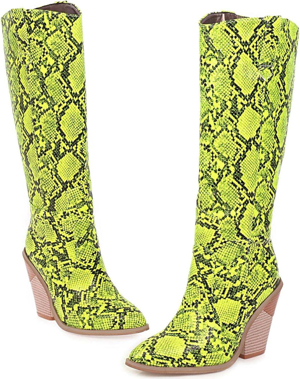 SHEMEE Women's Snake Skin Knee High Boots Chunky Heels Western Cowboy Cowgirl Boots Snakeskin Print Block Heeled Tall Boots(Green)