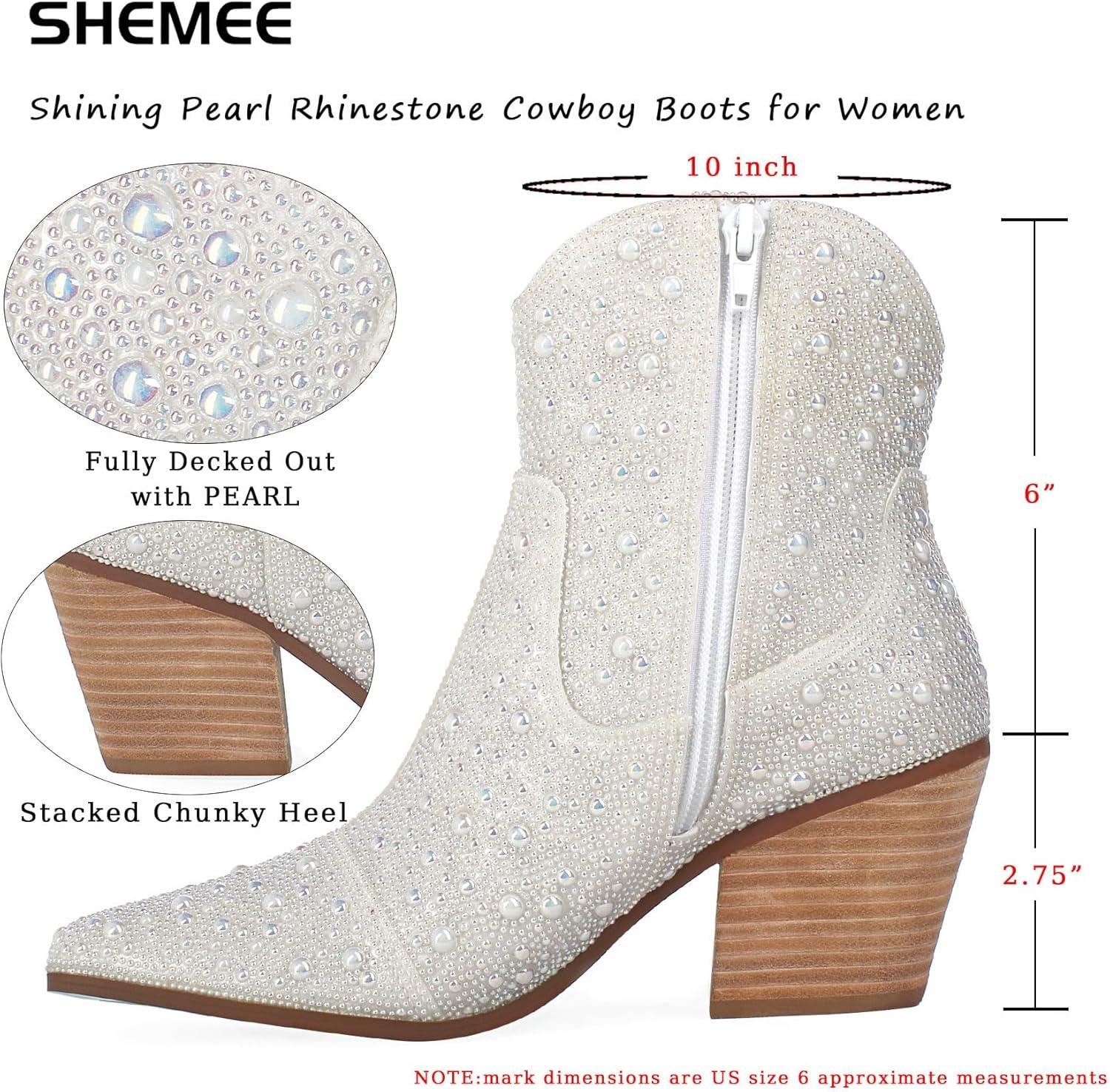 imageSHEMEE Womens Sparkly Rhinestone Cowboy Boots Chunky Block Heels Ankle Booties Shine Glitter Western Cowgirl Boot Wedding Bride Party Short BootsWhite